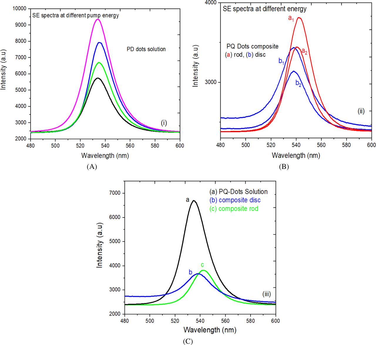 The spontaneous emission spectra of the PQ-Dot solution, composite polymer rods and disks were studied, and the ASE condition was examined at 355 nm, 420 nm, 450 nm, and 465 nm using an exciting laser source of a high-power tunable picosecond laser system. Different low energies of all laser sources were used. The spontaneous emission spectra of the PQ-Dot solution composite polymer rods and disks excited by the 355-nm laser source at different energies are shown in Figures 5A and 5B. The observed peak of the composite at 534 nm slightly shifted from the relative emission peak of the PQ-Dot solution at 541 nm, as seen in Table 1. But, the corresponding intensities are influenced by the pumping energy; for instance, when the laser pump energy increases from 2 μJ to 8 μJ, the intensity of the PQ-Dot solution inclines, as shown in Figure 5A.
