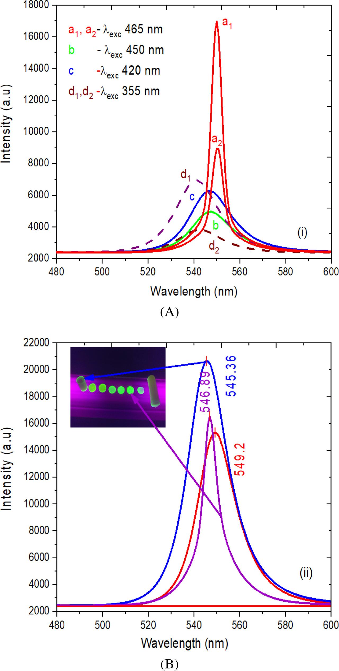Three laser sources (420 nm, 450 nm, and 465 nm) were excited with the OPG) system. The comparison of the spontaneous emission spectra observed from the different excitation laser sources is displayed in Figure 6A. The spontaneous emission spectra of the rod are noticeably narrowed with increase in intensity when it was excited by the 465-nm laser source. A relative shift in peak positions is obtained at excitation wavelengths of 355 nm, 420 nm, and 450 nm, respectively. The obtained narrow bandwidth and intensity of the spontaneous emission spectra excited by 465 nm seem to exhibit stimulated emission.