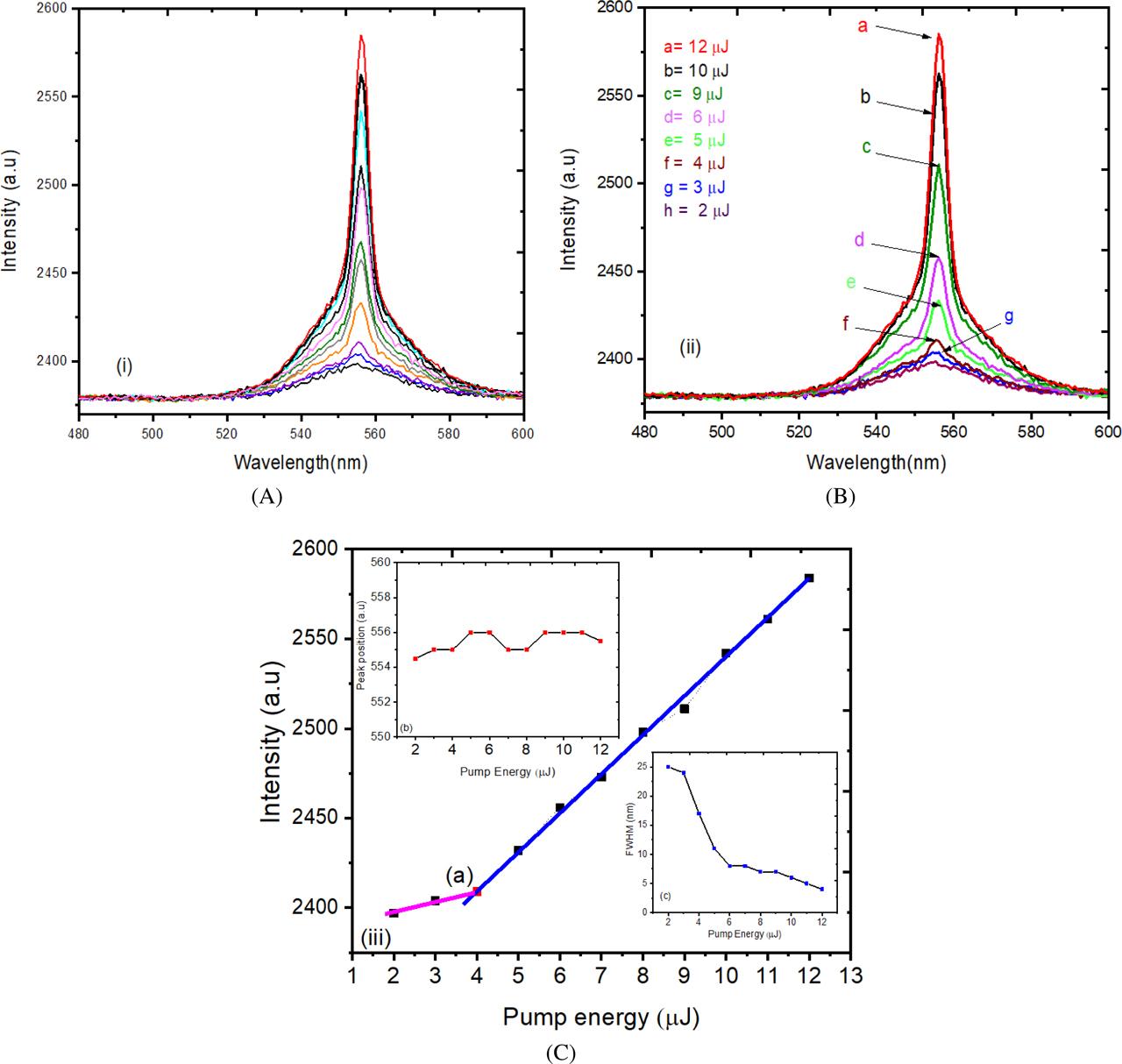 The full width at half maximum (FWHM) is changed when the pump energy applied is changed from 2 μJ to 4 μJ. The lowest narrow bandwidth is detected when the pumping energies used are from 5 μJ to 12 μJ, and the observed features are ASE-like spectra, as noted in Figure 7A. The ASE is achieved with a threshold energy of 4 μJ/cm2, as shown Figure 7C-a.