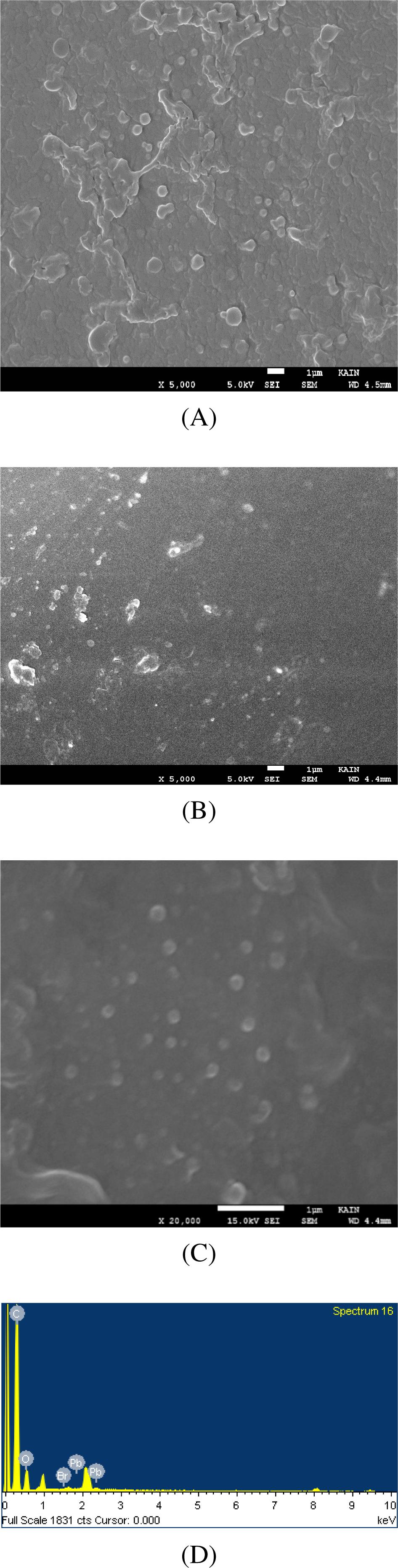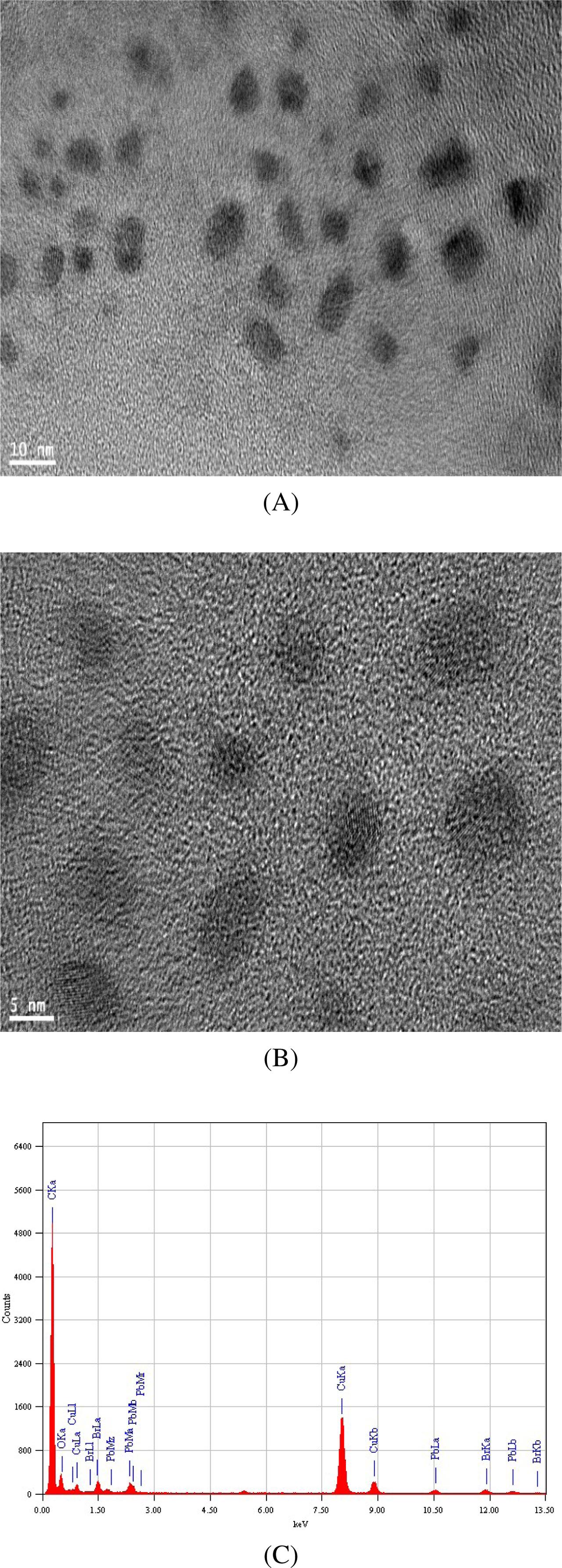The crystalline nature of the Q-Dots in solution is seen in the high-resolution image shown in Figure 9B. The energy dispersive X-ray spectroscopy (EDX) spectra indicate the presence of Pb and Br in the solution (Figure 9C). Similarly, the TEM images of the PQ-Dot particles in the solid polymer environment at low and high resolutions are shown in Figures 10A and 10B. There is no aggregate of PQ-Dot particles in the composite.