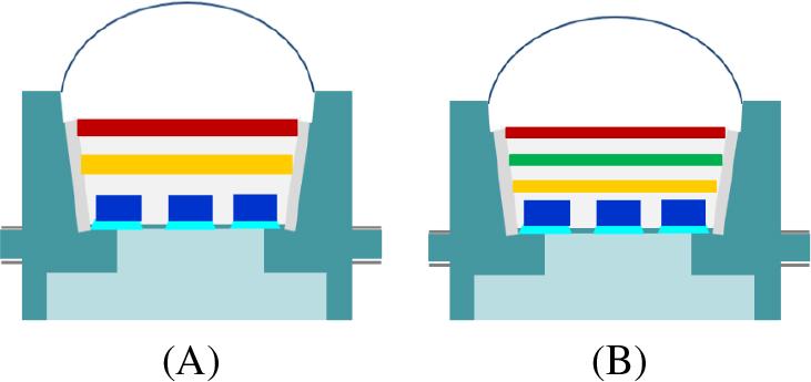 Schematic diagrams of (A) DL remote phosphor configuration, (B) TL remote phosphor configuration. DL, double-layer; TL, triple-layer