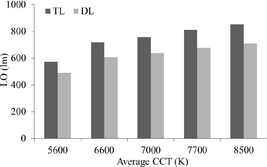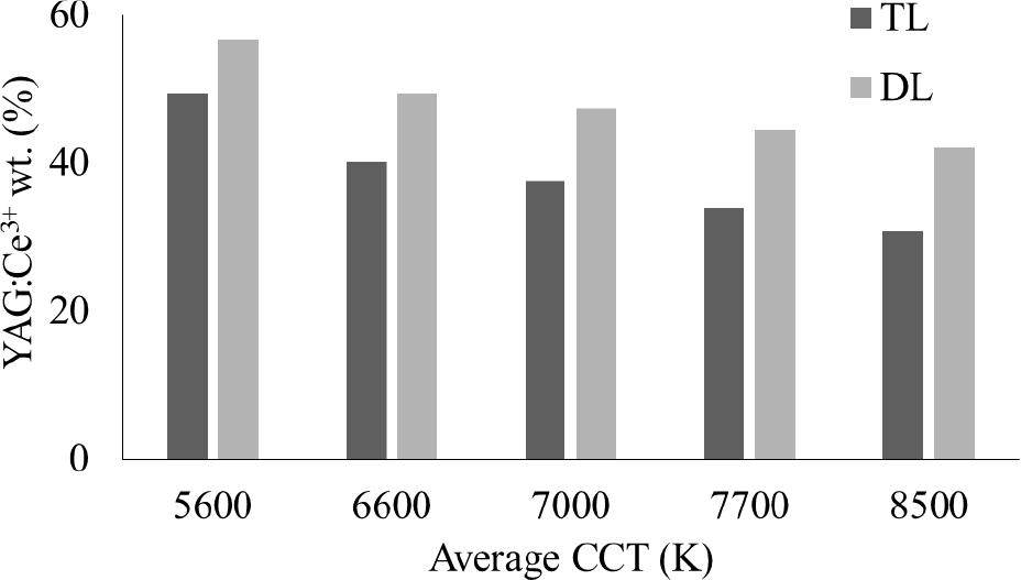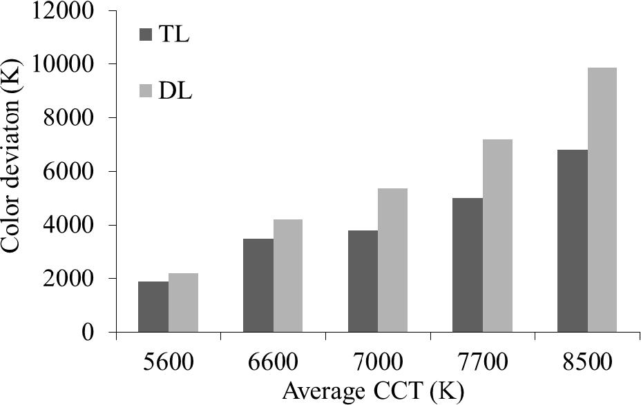 Color deviation (D-CCT) of TL and DL phosphor configurations at each CCT. CCT, correlated color temperature. DL, double-layer; TL, triple-layer