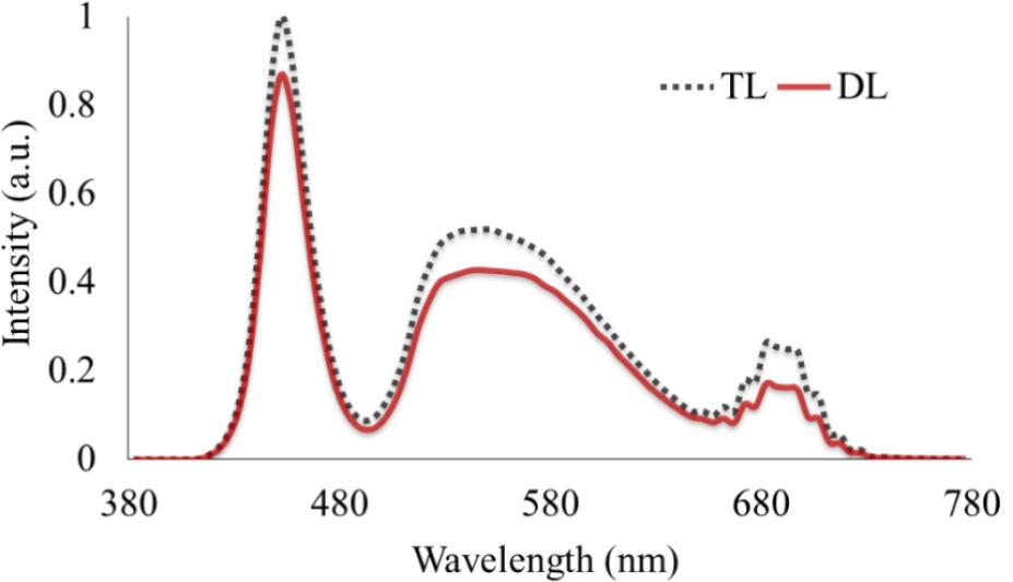 Emission spectra of DL and TL phosphor structures. DL, double-layer; TL, triple-layer