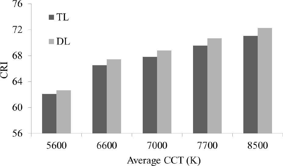 CRI values of DL and TL phosphor configurations at each CCT. CRI, color rendering index; CCT, correlated color temperature; DL, double-layer; TL, triple-layer