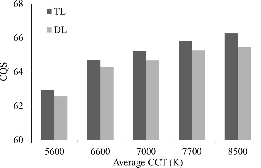 CQS values of DL and TL phosphor configurations at each CCT. CQS, color quality scale; CCT, correlated color temperature; DL, double-layer; TL, triple-layer