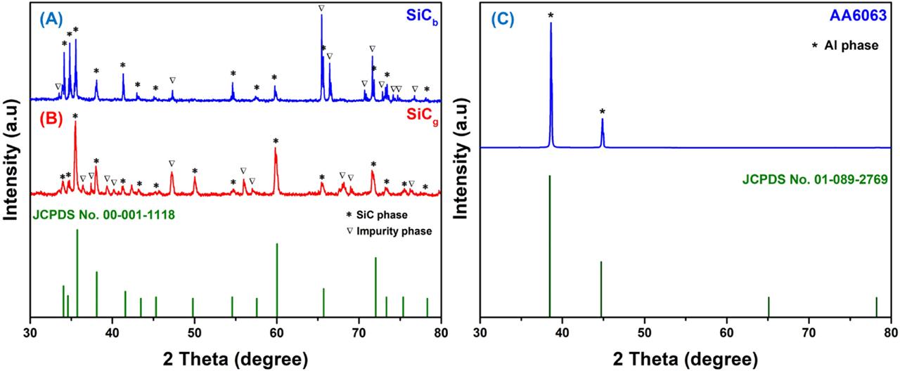 XRD patterns of (A) SiCb, (B) SiCg, and (C) AA6063. XRD, X-ray diffraction