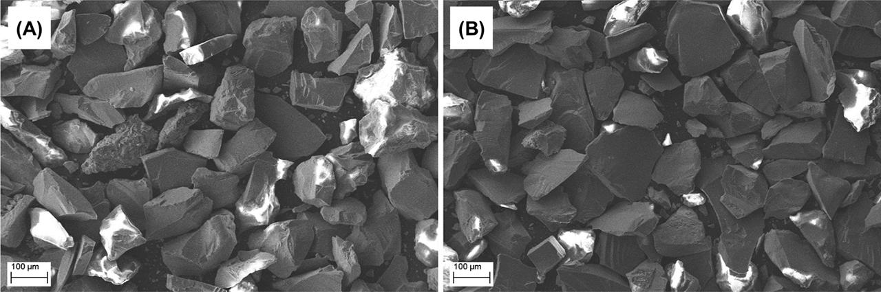 The morphological properties of the purchased SiCb and SiCg were assessed from the SEM micrographs, which are provided in Figures 2A and 2B. From the images, it is clear that the SiC particles are in the size of ~100 μm, with irregularly shaped blocks. Further, SiCg shows sharp edges compared to SiCb, suggesting the extra-brittle nature of SiCg.