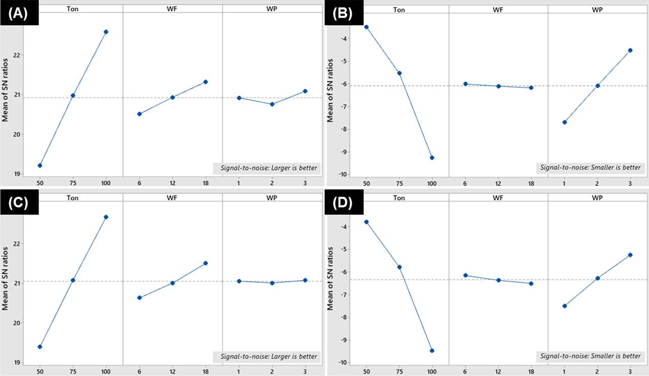 Figures 3A–3D display the influence of the input parameters on the S/N ratios of MRR-1, Ra-1, MRR-2, and Ra-2, respectively, where the strategy “larger is better” is applied for MRRs and “smaller is better” is applied for Ras. From Figure 3A, it is inferred that MRR-1 is influenced by the input parameters in the order TON>WF rate > FP. Likewise, the S/N ratios of MMR-2 also display the same pattern of parameter influence (Figure 3C). As the TON is increased, the heat generated due to the electrical discharge becomes high, leading to the melting and evaporation of the base metal, constituting better MRR. Following TON, the WF rate influences the WEDM process to yield better MRR. During the WEDM process, the electrical discharge from the machining wire tends to remove the materials, making the space vacant. Therefore, for continuous machining, the wire is fed along the direction of machining. Hence, the WF rate constitutes an important parameter for MRRs, whereby a low rate may cause dampened MRR and a high rate may hinder the machining performance. The dielectric medium (parameter FP) is used to keep the temperature under control and remove all the debris from the machining area. Therefore, its pressure determines how far the temperature is controlled and how well the debris is removed. For MRR-1 and MRR-2, the parameter FP displays the least influence, validating that not much temperature difference is caused due to different FPs. Further, the debris removal process does not have a significant effect on the MRR. Figures 3B and 3D show the effect of the input parameters on the S/N ratio of Ra-1 and Ra-2, respectively. For both Ras, the input parameters that influence the S/N ratio are in the order TON>FP >WF rate. It is obvious that as TON increases, the MRR increases, leading to high Ra. However, for better machining performance, the Ra should be minimum, and therefore, high TON has a negative impact on Ra. Unlike the S/N ratio of MRR, FP has a significant impact on Ra. This may be due to the efficient removal of debris from the machining area with high FP. If the debris is not removed efficiently, the debris itself melts during the WEDM process, forms a layer over the machined surface, and solidifies, constituting a recast layer. This recast layer will not be a smoothened surface but is rough, which tends to increase the Ra value of the machined surface. Therefore, as the FP increases, the Ra tends to reduce. Ra is least affected by the WF rate. However, a high WF rate constitutes high MRR and should result in a high Ra. But, due to the influence of FP, the influence of the WF rate becomes a combined effect.