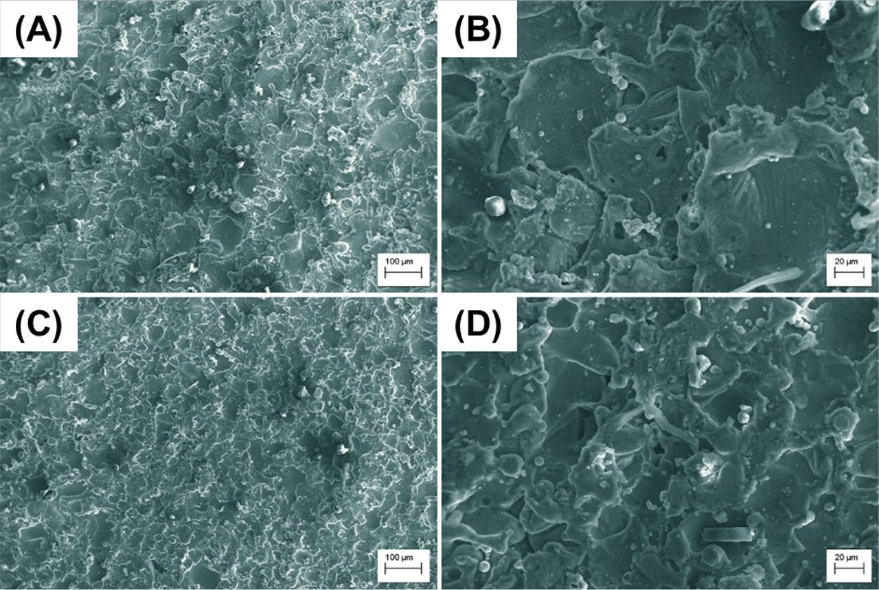 SEM micrographs of WEDM-processed surfaces: (A, B) AA6063/SiCb and (C, D) AA6063/SiCg. SEM, scanning electron microscopy; WEDM, wire-cut electrical discharge machining