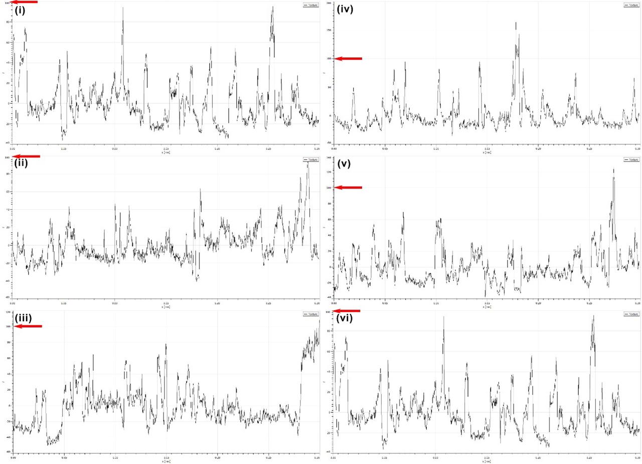 Texture analysis from Figure 4B (i–iii) and Figure 4D (iv–vi) at three different positions using Gwyddion image processing software (the red arrow denotes the 100-count mark)