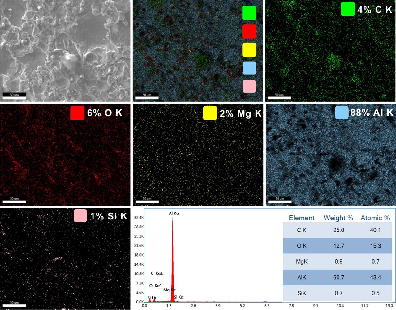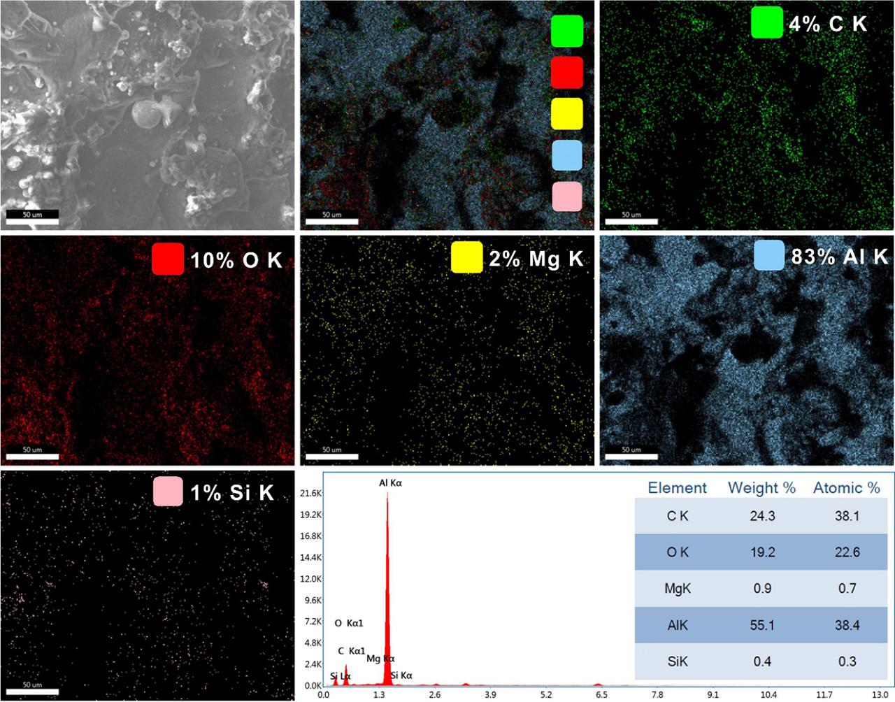 EDX mapping analysis over the machined surface of AA6063/SiCg. EDX, energy dispersive X-ray spectroscopy; C, carbon; O, oxygen; Mg, magnesium; Al, aluminium; Si, silicon