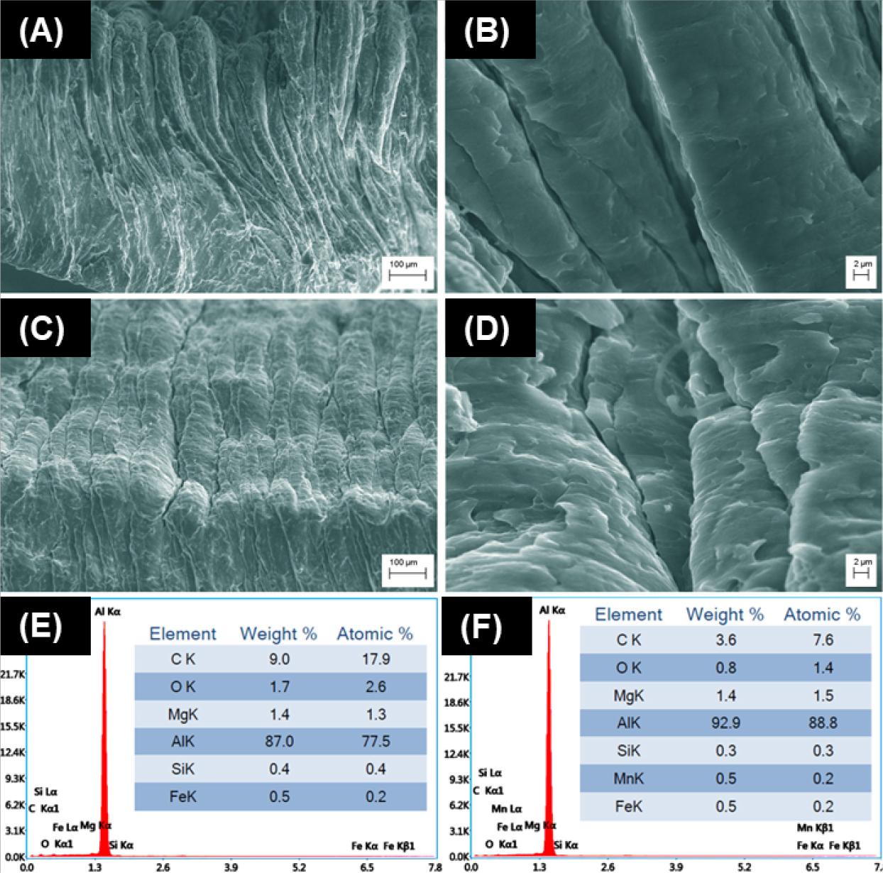 SEM micrograph of debris generated from (A and B) AA6063/SiCb and (C and D) AA6063/SiCg. EDX analysis of debris generated from (E) AA6063/SiCb and (F) AA6063/SiCg. EDX, energy dispersive X-ray spectroscopy; SEM, scanning electron microscopy