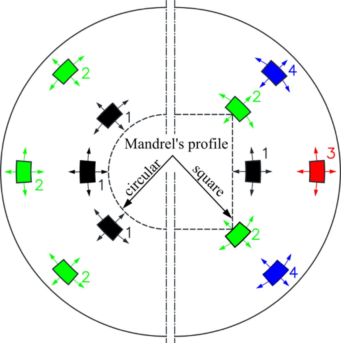 The rotational forming of products with a non-circular cross-section, due to the lack or a limited number symmetry axes, takes place under condition of inhomogeneously arising stresses in the material during the process. The size of the stress heterogeneity depends on the degree of axial asymmetry of the mandrel, as shown on the right side of Figure 1, where different values of stresses will arise depending on the point of contact of the spinning roller with the material. It will cause inhomogeneous strains as: ɛ1 ≠ ɛ2 ≠ ɛ3 ≠ ɛ4.