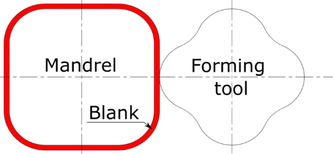 The presented mandrel is a square in cross-section, so it has only four axes of symmetry. This means that the material distribution resulting from its flow due to stresses exceeding Re in the blank is not the same in all directions. It depends on the degree of asymmetry of the mandrel's geometry. The material flow will occur in privileged directions, which will depend on several conditions, such as the geometry of the blank, type of material, and strain hardening.