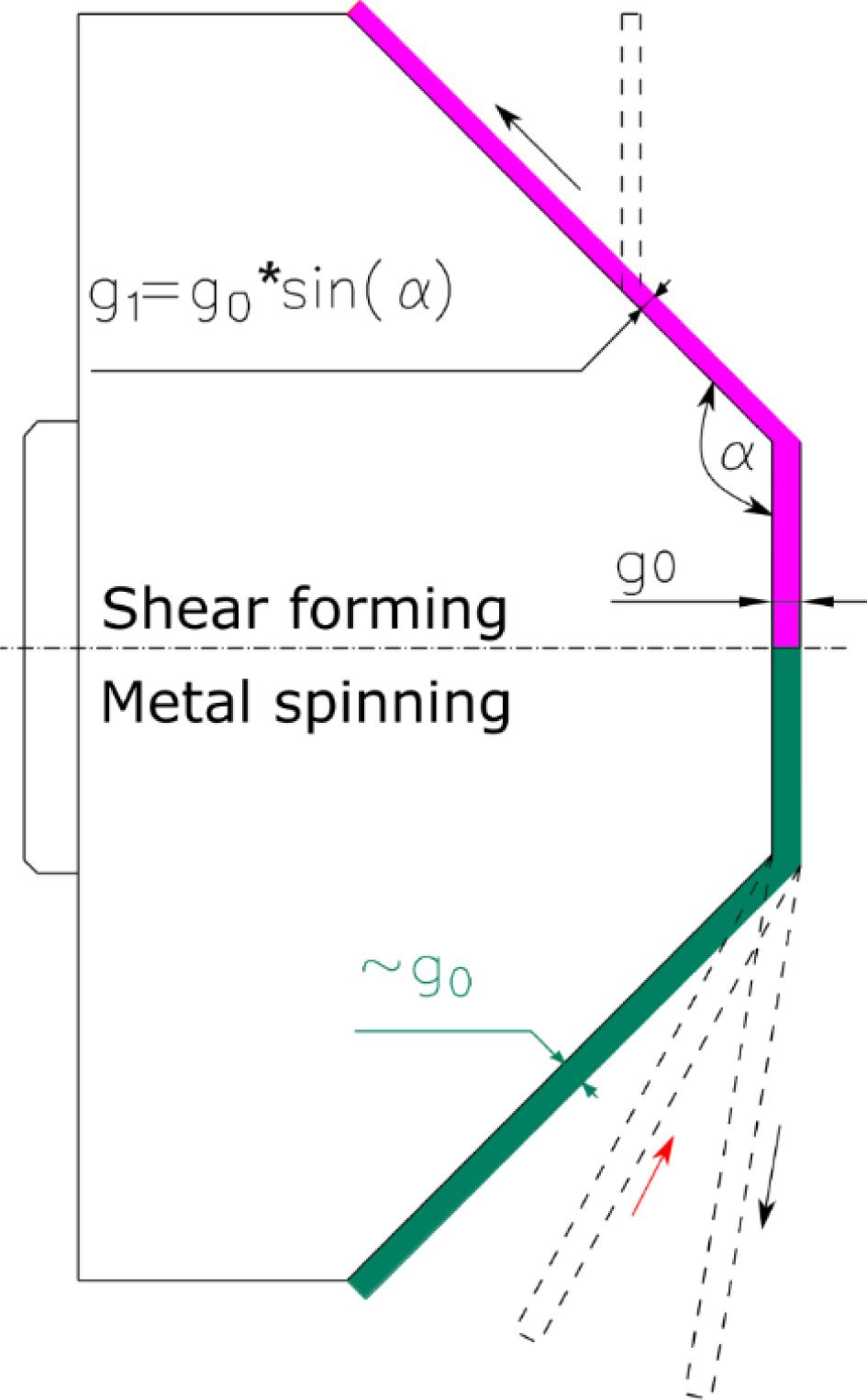 Analysis of the literature indicates that many authors, in their works [4, 5, 7, 8, 24], refer to the rotary forming process of axially asymmetrical products as spinning, while the trajectory and character of the process applied by them have more features similar to shear forming than metal spinning. A characteristic feature of shear forming is that it occurs in one motion, which forms the side wall to the planned thickness arising from the formula. Shear forming introduces only tensile stress. The spinning process takes place in several movements and may consist of movements introducing both compressive and tensile stresses or solely tensile stresses. In effect, the obtained thickness of the drawpiece will be a resultant of the stresses introduced, while the side wall thickness reduction is an unintended effect. A comparison is shown in Figure 3. It should be emphasized that this linguistic error does not arise from the bad faith of the authors, but from the fact that spinning of products with a noncircular shape has been the subject of research for a relatively short time. Designing a trajectory that introduces only tensile stresses is easier to do as it does not require such expansive CNC code.