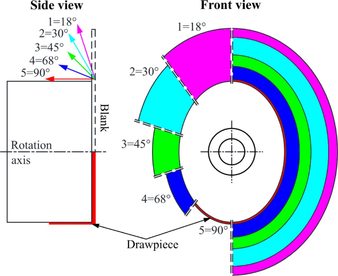 Method 1, utilizing mathematical formulas and spreadsheets to describe the mandrel's outline, is the most difficult and time-consuming method due to the fact that the trajectory must consist of an appropriately high resolution of manually generated coordinating points. During spinning of axially asymmetrical products, it is necessary to perform multiple mandrel revolutions synchronized with the advance rate of the spinning roll on the x and z axes. The complexity of the spinning trajectory's CNC code increases as per the product: 360 commands × number of revolutions. This product means that a single movement of the spinning tool requires ≈ 75,000 g-code lines to obtain a draw-piece with a noncircular cross-section in the shape of an ellipse on mandrel no. 1 from Figure 4. Over 300 000 g-code lines were used in total to obtain the drawpiece. Due to its complexity, this method requires the creation of five separate trajectories of the spinning tool's motion, in which the spinning tool performs spinning movements that stretch the material and position the piece's side wall at angles of 18°, 30°, 45°, 68°, and 90°, according to Figure 6. The goal of these tests was to produce a drawpiece with a height of 30 mm.