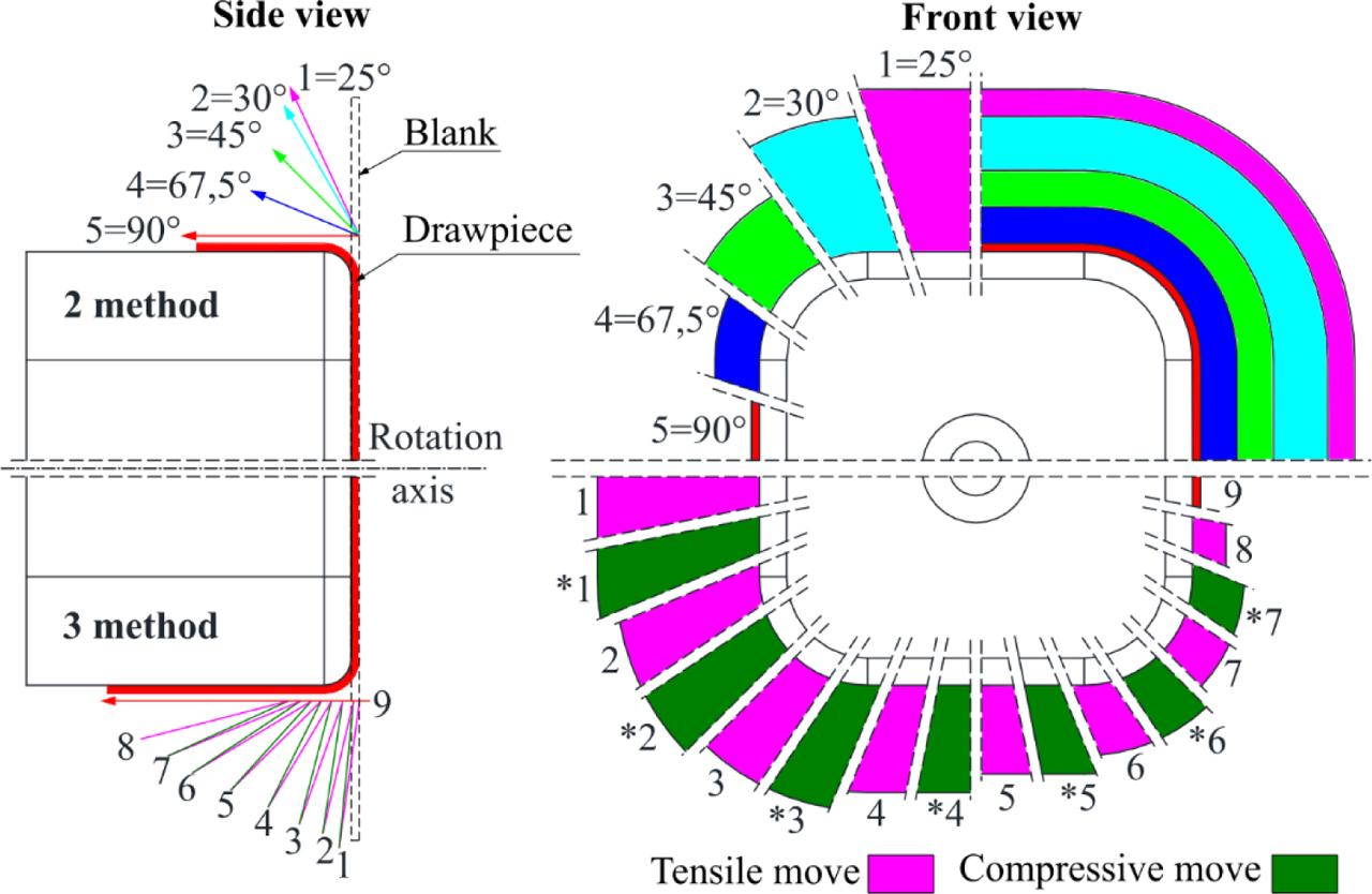 The second method of designing the spinning trajectory was to apply the 2D CAD software. This method requires the application of a model in which the cross-section of a noncircular mandrel, having precisely one degree of freedom, namely, its rotation around its axis, which, under real-life conditions, will be co-linear with the axis of the spinning lathe's spindle. The mandrel's outline must be found in a relation of continuous contact with the model of the spinning roll. Next, the xi and zi position parameters must be noted manually depending on the mandrel's angle of rotation. This is a time-consuming method, but in contrast to the method based on the use of spreadsheets, it is more flexible and easier to apply to cross-sections with more geometrically complex shapes. The method was applied to produce the piece on mandrel no. 2, with a square cross-section according to the model in Figure 5. Over 168 000 g-code lines were used in total to obtain the drawpiece. Due to its complexity, this method requires the creation of five separate trajectories of the spinning tool's motion, in which the spinning tool performs spinning movements that stretch the material and position the piece's side wall at angles of 25°, 30°, 45°, 68°, and 90° according to Figure 7. The goal of these tests was to produce a drawpiece with a height of 30 mm.