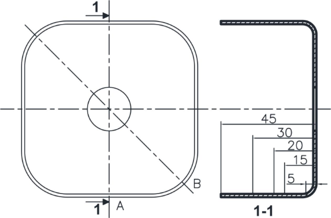 Mandrel no. 2 – the square shown in Figure 5, on which spinning tests were performed using Methods 2 and 3. The scheme of wall thickness measurements consistent with Figure 8 was applied to the square drawpiece.