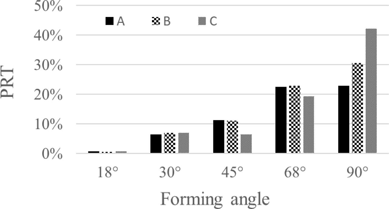 Analysis of the results given in Table 2 indicates that the PRT value is low for angles 18°, 30°, and 45°. A substantial increase occurs during forming at the angles of 68° and 90°. The results indicate that PRT for sites A, B, and C for angles 18° and 30° is at a similar level. It was observed that, for angles 45° and 68°, PRT is lower at measurement site C than at other sites of measurement. This is not a constant dependency, and during forming at the angle of 90°, PRT at every measurement site differs and grows in the following manner: A < B < C. The average PRT value results from Table 2 are shown in Figure 9.