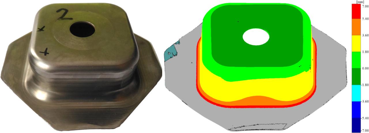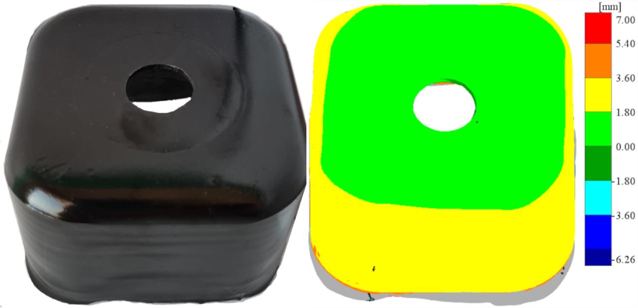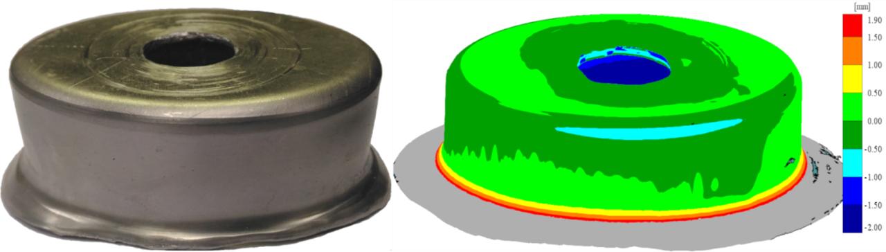 The spun drawpieces were scanned on the ATOS COMPACT SCAN 5M mobile optical scanner. In the dedicated GOM INSPECT V8 Professional software, the scanned shapes of the drawpieces were compared with the CAD models and the deviation was shown in the form of a figure.