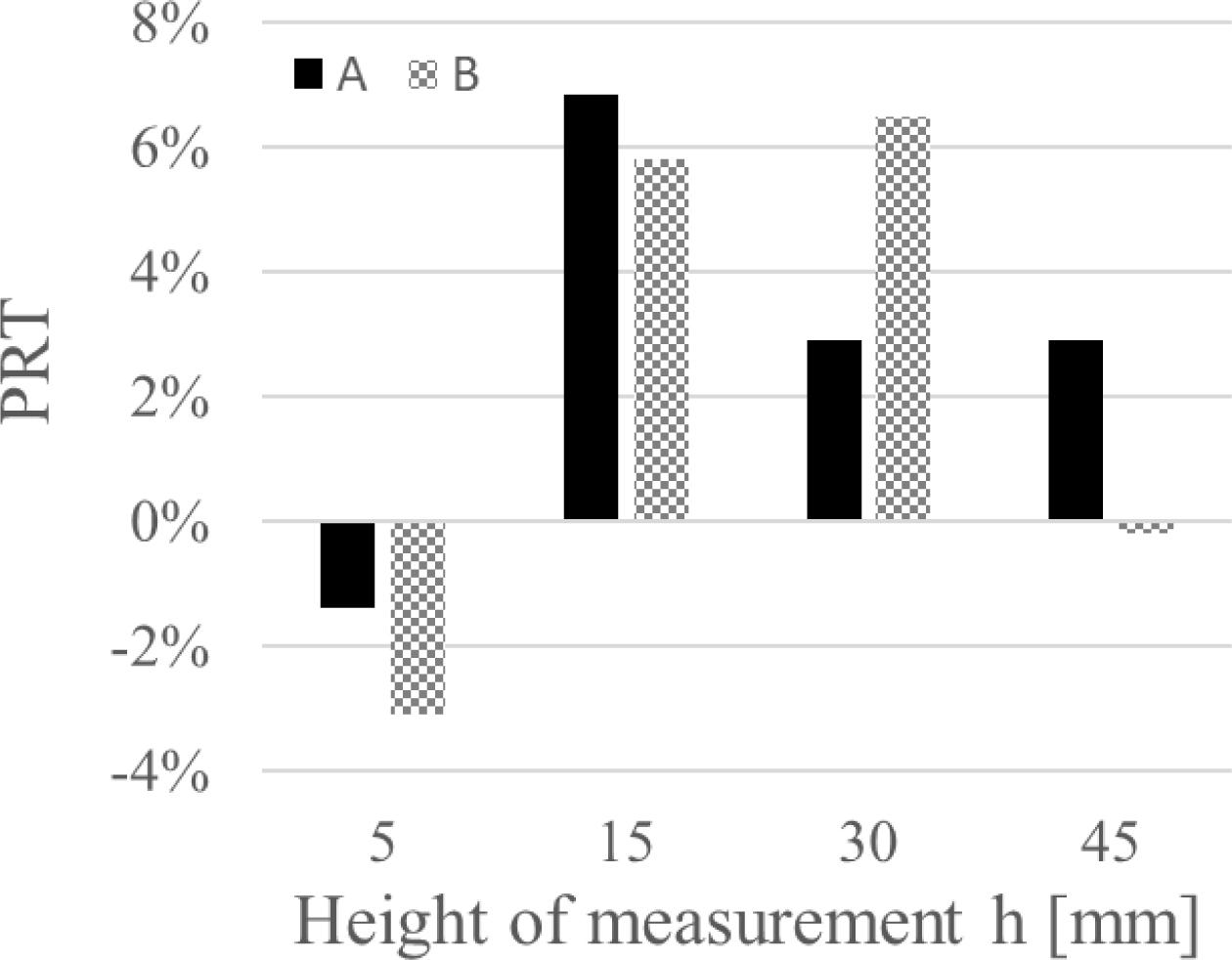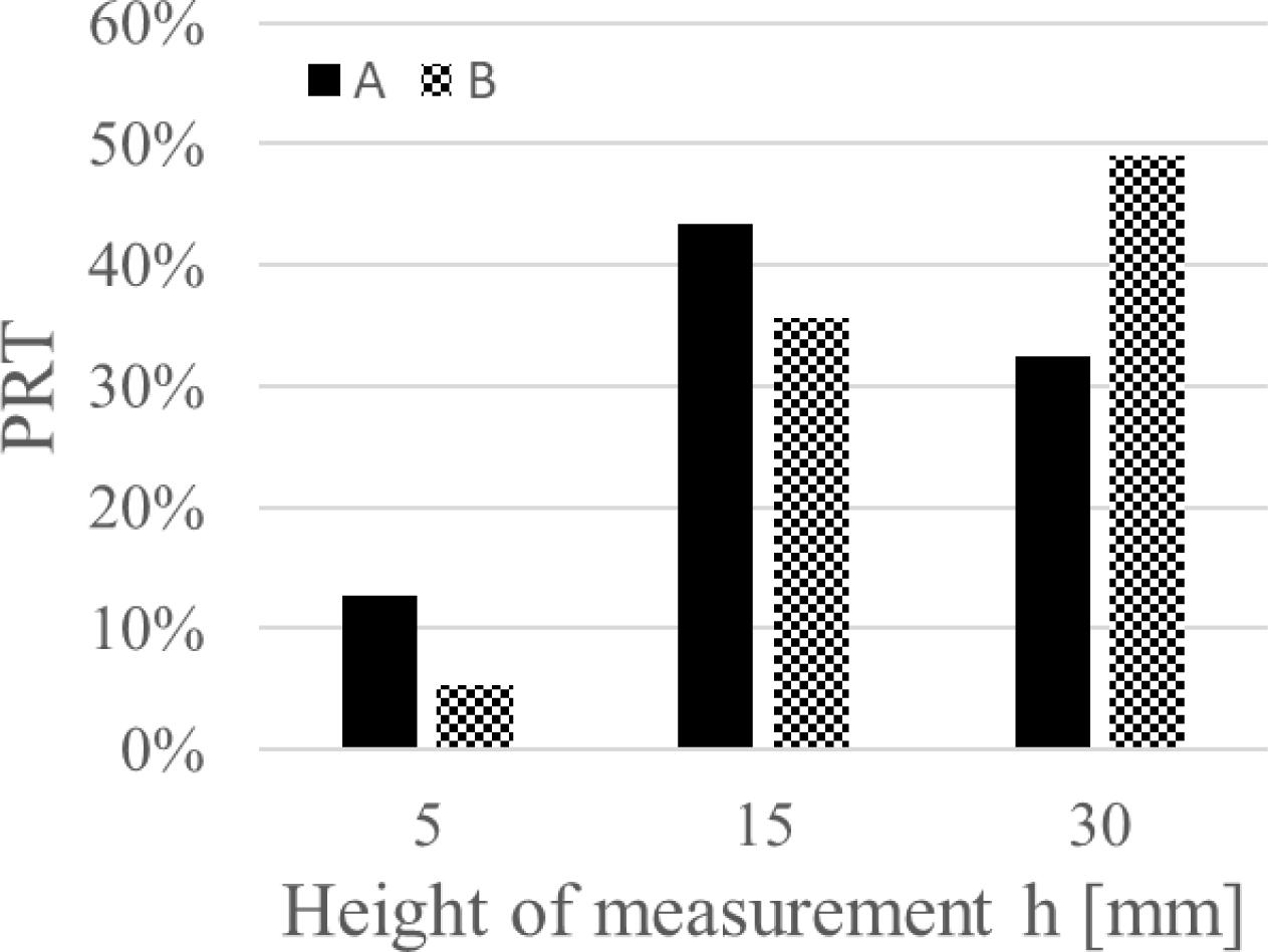 The chart of average m values from Table 3, for Method 2, indicates that there is a significant divergence in PRT between the heights of 15 mm and 30 mm. Despite the fact that no upsetting movements were applied in this method, PRT for site A is subject to reduction from a value >40% to >30% between the height of 15 mm and 30 mm. Most likely, at the height of 30 mm, material from the corners flowed in the direction of the planar surfaces at site A.