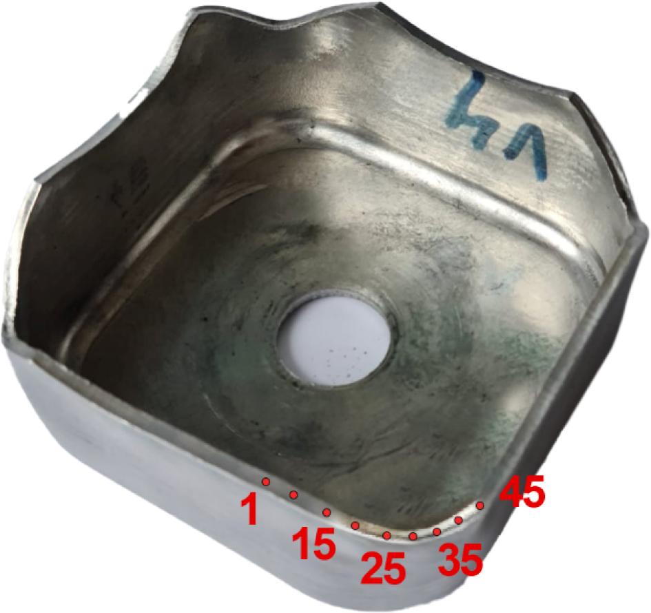 In the next step, spinning of square drawpieces was carried out using the trajectory generated by Method 2. The spinning process consisted of five trajectories according to Figure 7, which were initiated manually in succession. The results of the thickness measurements are given in Table 3.