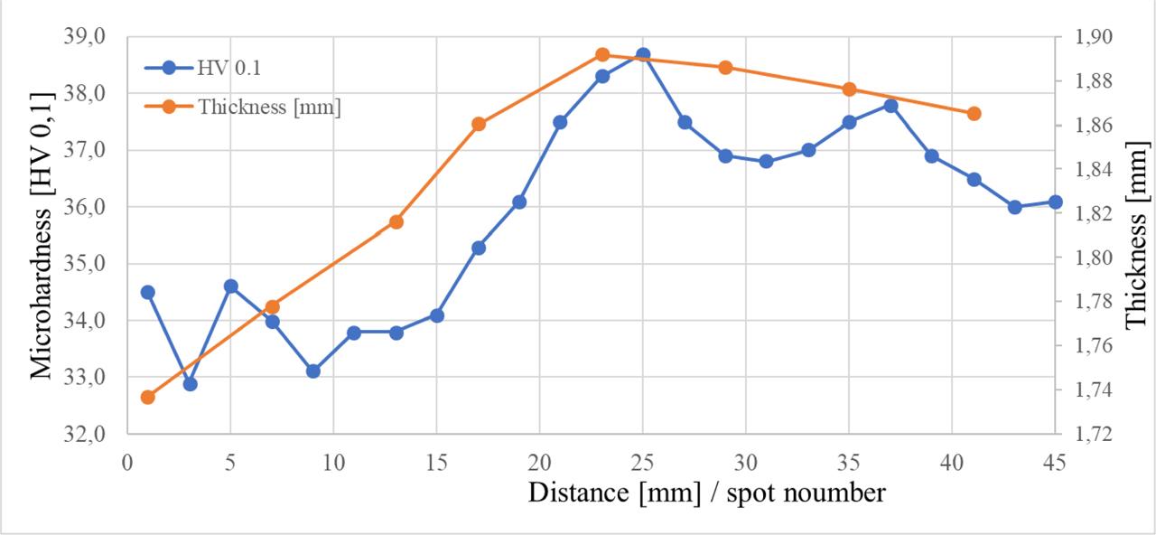 Figure 16 shows an auxiliary graph for the drawpiece thickness measurements. Measurements show that on a flat surface at a distance from 1 mm to 23 mm, the material thickness increases. After reaching the local extreme, the wall thickness is reduced to a distance of 42 mm. Measurements show unusual material behavior during processing. Compared with spinning an axially symmetrical product, the material thickness and the peripheral hardness should be uniform. The performed measurements show that there is no such relationship in the axially asymmetric spinning. Measurements show that flat surfaces have a lower material thickness and lower hardness, while at the point where the surface passes into the arc, the material thickness and hardness increase. This is contrary to the expected situation, where an increase in the hardness of the material would cause a greater thinning of the material. The above observations indicate that the spinning tool significantly compresses the material and forces it to move in the circumferential direction. The above observation is correct for the first quarter of the arc, since the local maximum hardness occurs around this point. Then the hardness and thickness of the material are lowered in the further part of the arch. These results confirm the observation made in [6].