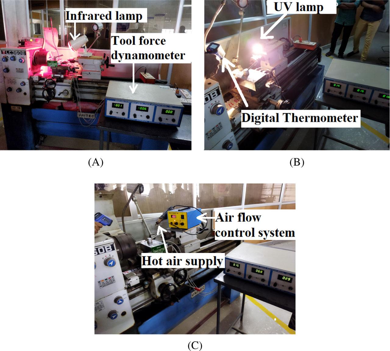 Experimental setup: (A) IR-assisted machining; (B) UV-assisted machining; and (C) HA-assisted machining.