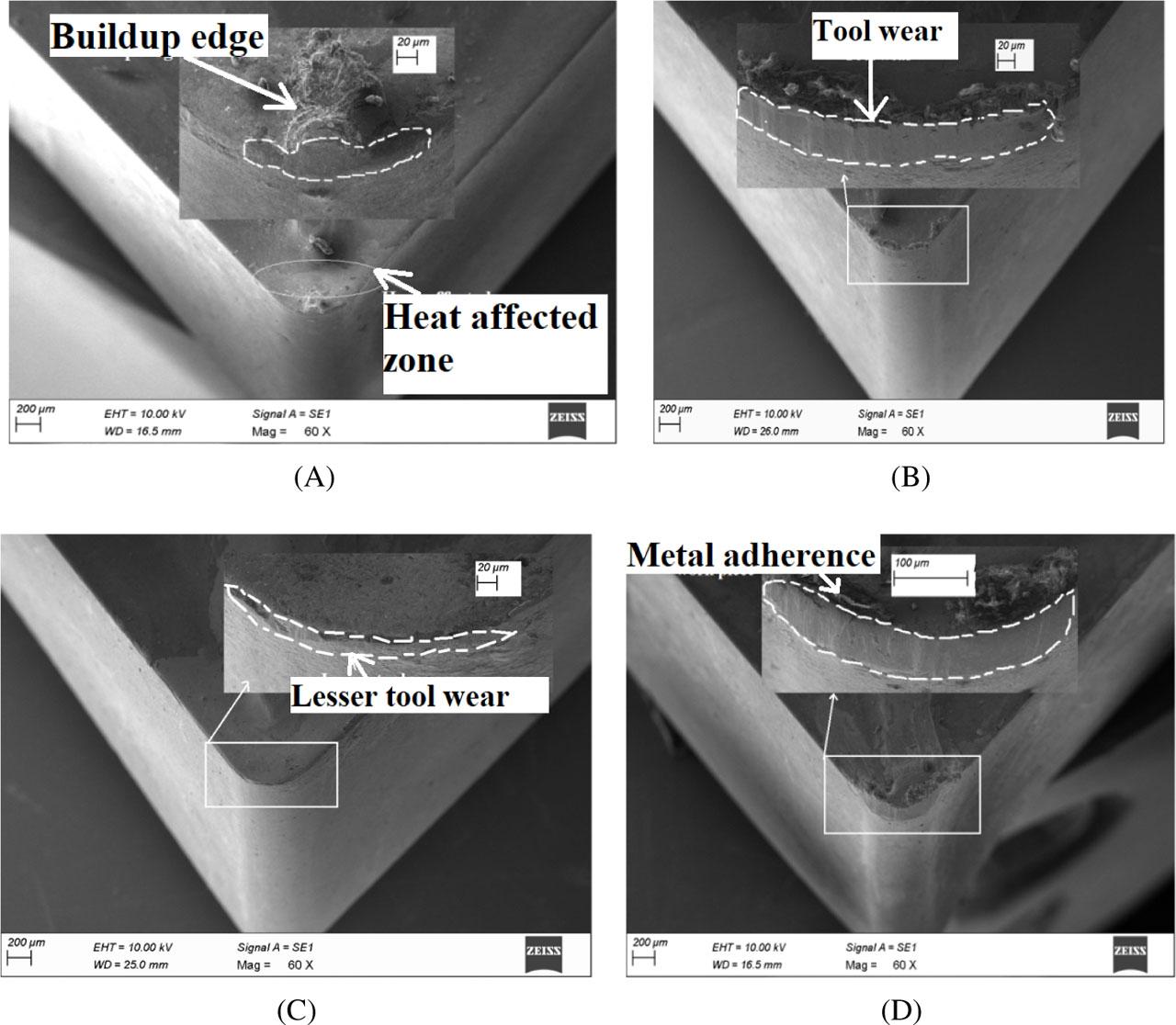SEM image of tool edges machined with (A) IR-assisted heating, (B) UV-assisted heating, (C) HA-assisted heating and (D) normal conditions.
