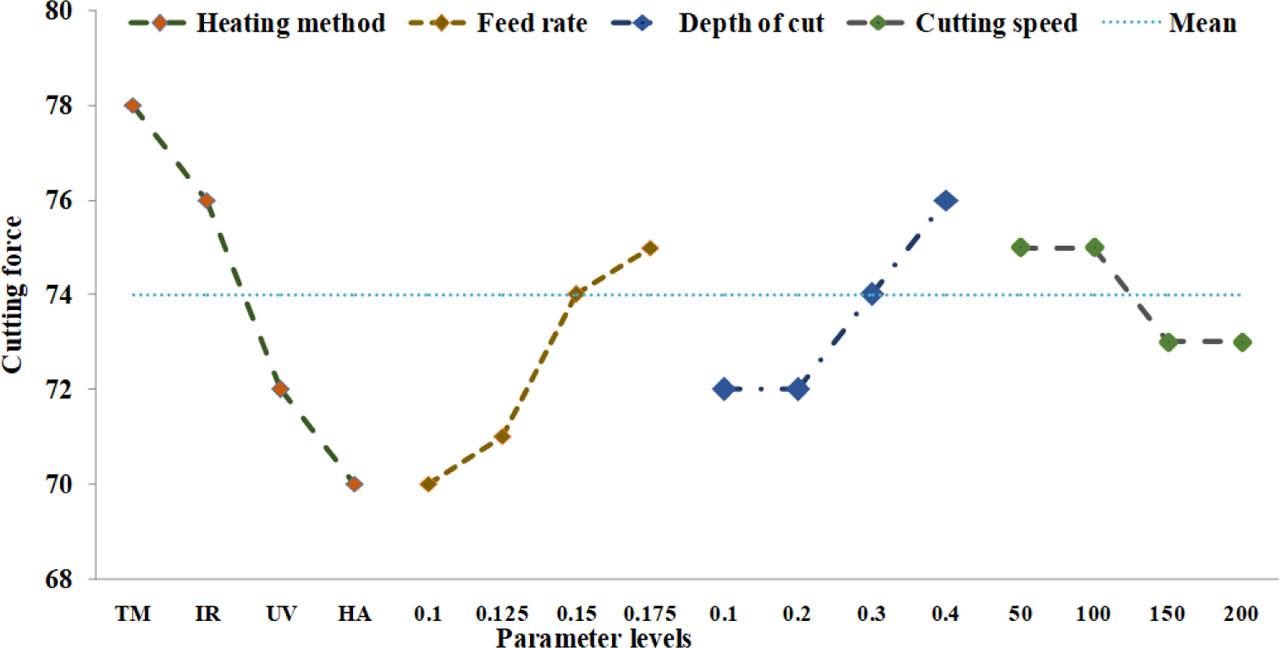 The turning process for duplex SS was optimised for output responses, such as cutting force and surface roughness, with different heating techniques using the TOPSIS method. Based on Eqs. (1)–(8), the optimal values were determined. The outcomes of machining were allocated equal weights to obtain an appropriate parameter combination. The calculated preference values are presented in Table 3. The largest or uppermost preference values were considered as the appropriate parameter combination for lesser cutting force and higher surface quality and ranked as the first. According to Table 2, Experiment 16 showed the highest preference value (0.7132) and was ranked the first, and the experimental combination was the HA-assisted heating method, with a feed rate = 0.175 mm/rev, depth of cut = 0.1 mm and cutting speed = 150 m/min as the optimal solution using the TOPSIS method. Experimental runs 15 and 12 provided the second and third optimal combinations, respectively.