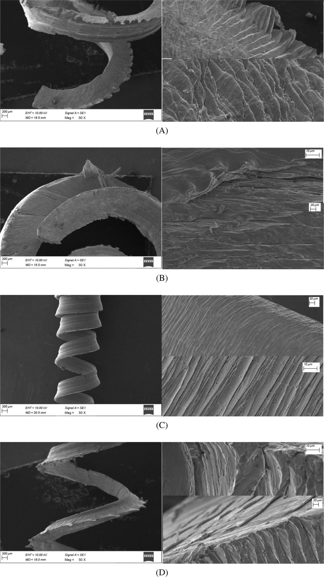 SEM image of chip microstructure under (A) IR-assisted machining, (B) UV-assisted machining, (C) HA-assisted machining and (D) normal machining.