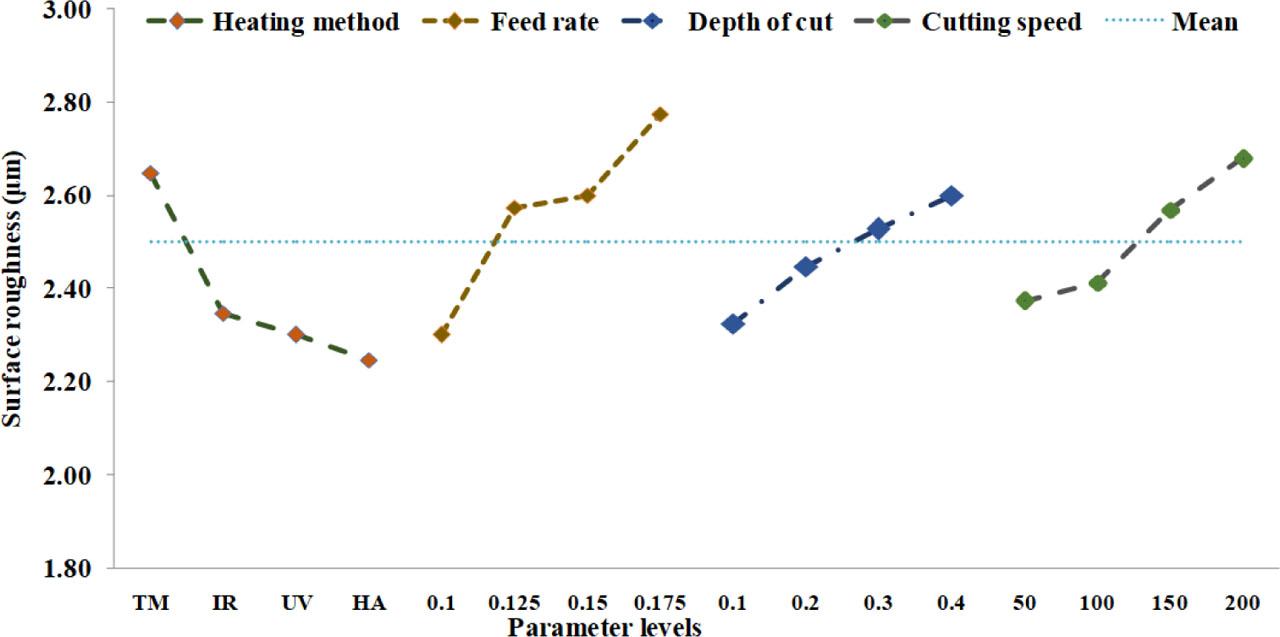 The influence of various input parameters on the surface roughness is displayed in Figure 5. The values of surface roughness were lower for heated machining than for normal machining. Among the heating methods, differences in terms of the final surface roughness were relatively lower for the HA-heating technique and it increased for the UV-assisted heating, IR-assisted heating and normal machining methods. The HA-assisted heating method produced the surface roughness of 2.2436 μm, which was 15.13% lesser than that obtained with normal machining. This was because the microstructure of the metal was elongated due to the application of heat over the surface, softening the surface [28]. This method also heated the work material faster than other heating techniques. Therefore, the HA-assisted heating method resulted in lesser cutting effects and lesser surface roughness. The UV-assisted heating method produced the surface roughness of 2.312 μm, which was the second-smallest value, and it was 13.14% lesser than that obtained for normal machining. The next lower surface roughness was acquired with the IR-assisted heating method, which produced a surface roughness of 2.346 μm, which was 11.41% lesser than that obtained for normal machining. Other parameters (such as feed rate, depth of cut and cutting speed) showed increasing trends with increases in different parameters. All these methods produced surface roughness values in the range of 2.3–2.775 μm. This was because applying external load against the rotating parts induced surface damages, resulting in higher surface roughness [29]. Figures 6A–6D show the surface of machined metals obtained using different heating methods.