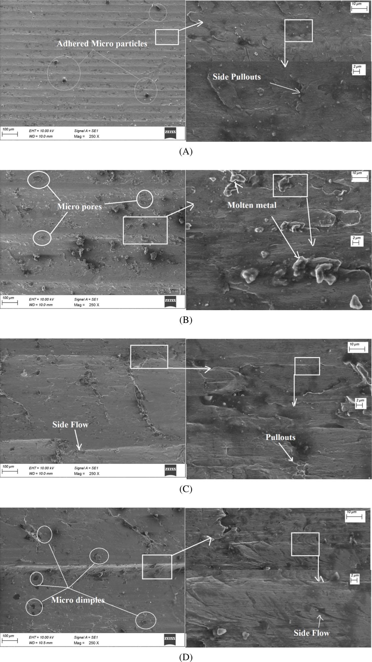 SEM images of machined surface obtained under (A) IR-assisted machining, (B) UV-assisted machining, (C) HA-assisted machining and (D) normal machining.
