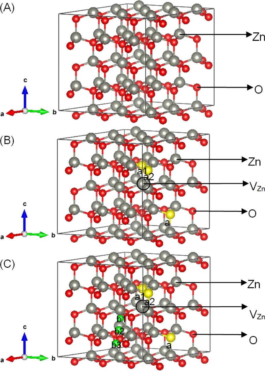 Model: (A) Zn36O36, (B) Zn35RO35 (R = S/Se/Te), and (C) Zn35RHiO35 (R = S/Se/Te).