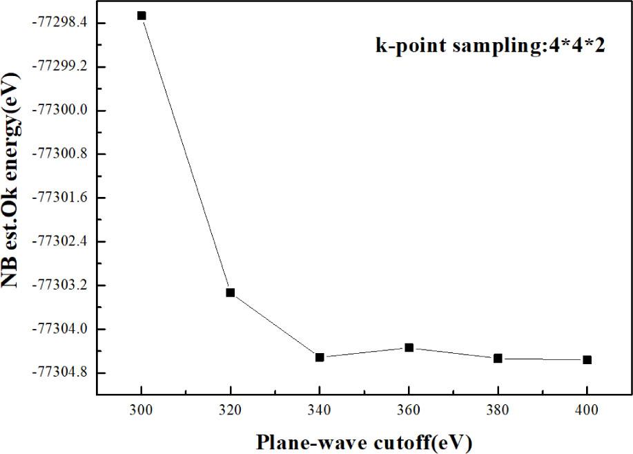 This paper uses the CASTEP (8.0) module in MS for calculations. Based on density functional theory (DFT) [23], generalized gradient approximation (GGA) was adopted [24], and the plane wave supersoft pseudopotential method based on Perdew–Burke–Ernzerhof (PBE) functional was selected [25]. The plane wave cutoff energy was set to 340 eV. The effect of different cutoff energies on the energy convergence of undoped Zn36O36 was tested. Figure 2 indicates that when the cutoff energy reaches 340 eV, the energy of the system converges and tends to be stable, and so the choice of a cutoff energy of 340 eV used in this paper may be said to be reasonable. This is consistent with previous calculations of the energy cutoff radius [26, 27]. The k point sampling of the first Brillouin zone was 4×4×2. The maximum interatomic force, maximum internal stress, and tolerance shift convergence accuracy were 0.01 eV·Å−1, 0.02 GPa, and 0.0005 Å, respectively. The electron density is not spin polarized, and the charge was set to values adapted to a given case. The valence electron configuration of each atom is: S–3s23p4, Se–4s24p4, Te–5s25p4, Zn–3d104s2, O–2s22p4, and H–1s1.