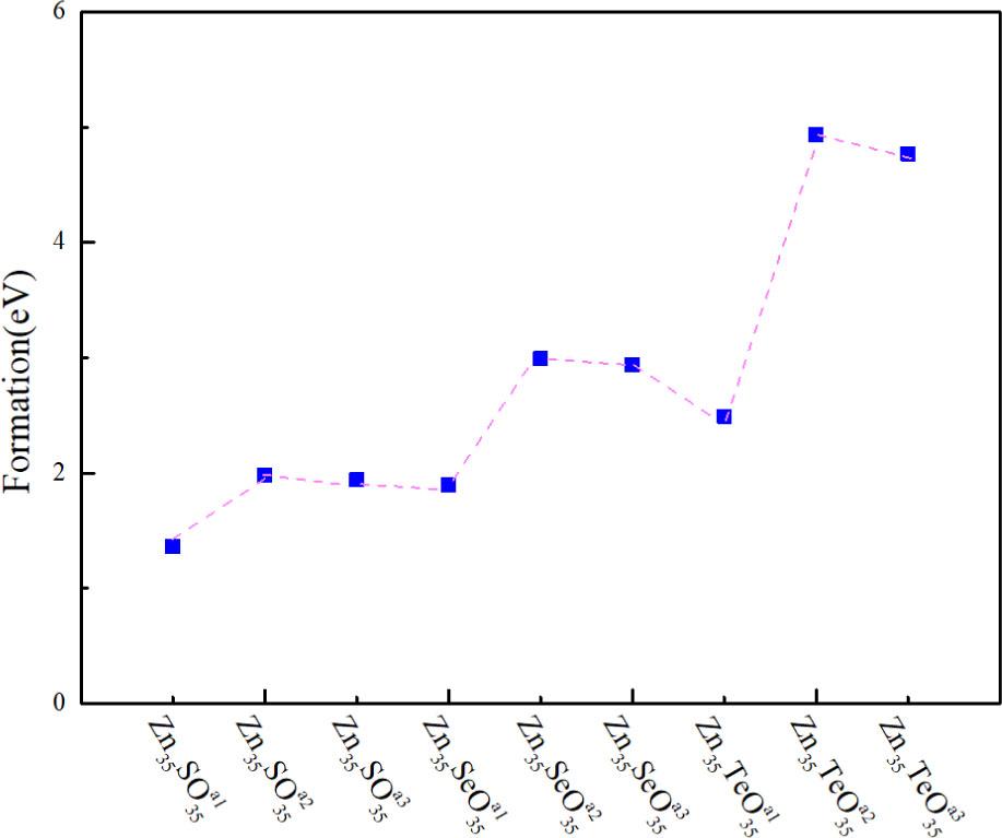Table 1 showed that the a, c, and V of Zn35RO35 (R = S/Se/Te) and Zn35RHiO35 (R = S/Se/Te) were larger than those of Zn36O36. One reason for this finding is attributable to the radius effect: the S/Se/Te ionic radius (2.14/2.24/2.42 Å) [29] is larger than the O ionic radius (1.71 Å) [29]. The second reason is the interionic force: the repulsive force between VZn and O, R (R = S/Se/Te) is greater than the attractive force between VZn and Zn in the Zn35RO35 (R = S/Se/Te) systems; the repulsive forces between H and VZn, between VZn and O, and between VZn and R (R = S/Se/Te) are greater than the attraction force between O and H, VZn and H, and H and R (R = S/Se/Te) in the Zn35RHiO35 (R = S/Se/Te) systems. Therefore, the volume of the Zn35RO35 (R = S/Se/Te) and Zn35RHiO35 (R = S/Se/Te) systems increases. Table 1 shows that compared with the
