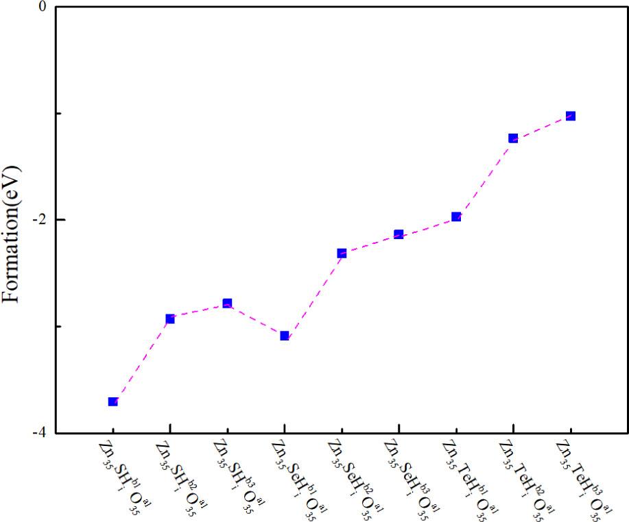 The system with the lowest formation energy in the Zn35RHiO35 (R = S/Se/Te) system was selected, and the formation energies of the b1, b2, and b3 positions of the Hi were calculated to explore the effect of the Hi position on the stability of the ZnO. The results are shown in Figure 4. The figure shows that the Ef of the Zn35RHiO35 (R = S/Se/Te) system also increased gradually with the increase in the distance between Hi and VZn. The formation energy of the