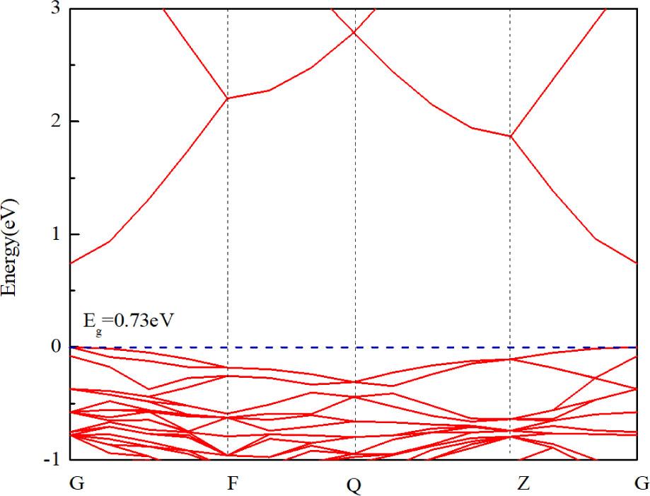 The calculated band structure of pure Zn36O36 system is shown in Figure 5. The bandgap of the pure Zn36O36 system is 0.73 eV, which is close to the calculated result available from the literature [37], but inconsistent with the experimental value (3.37 eV). This is because the energy of Zn–3d is overestimated when the architecture is calculated using GGA, resulting in an underestimation of the bandgap [38]. However, this error has little effect on the analysis of the relative physical quantities of the ZnO system.