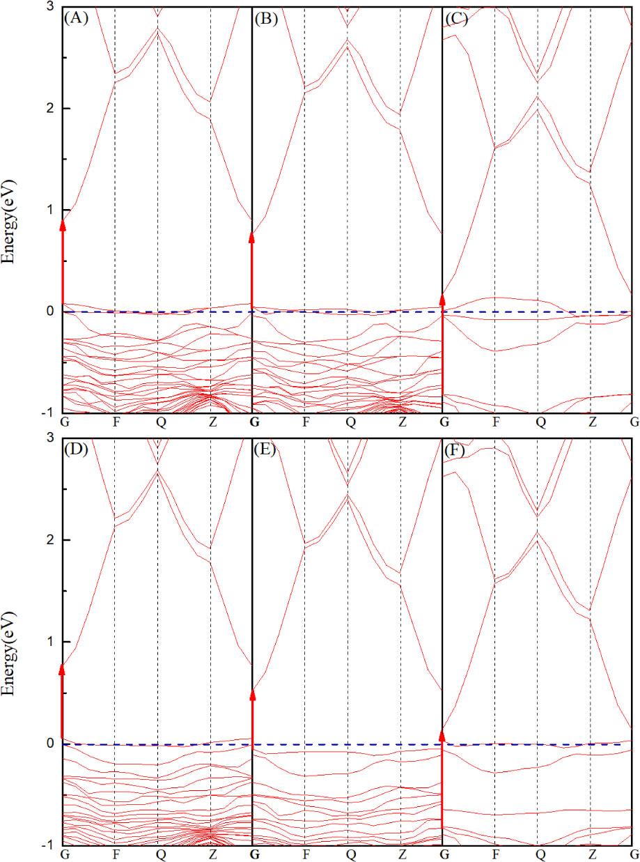 Band structure distribution: (A) Zn35SO35; (B) Zn35SeO35; (C) Zn35TeO35; (D) Zn35SHiO35; (E) Zn35SeHiO35; and (F) Zn35TeHiO35