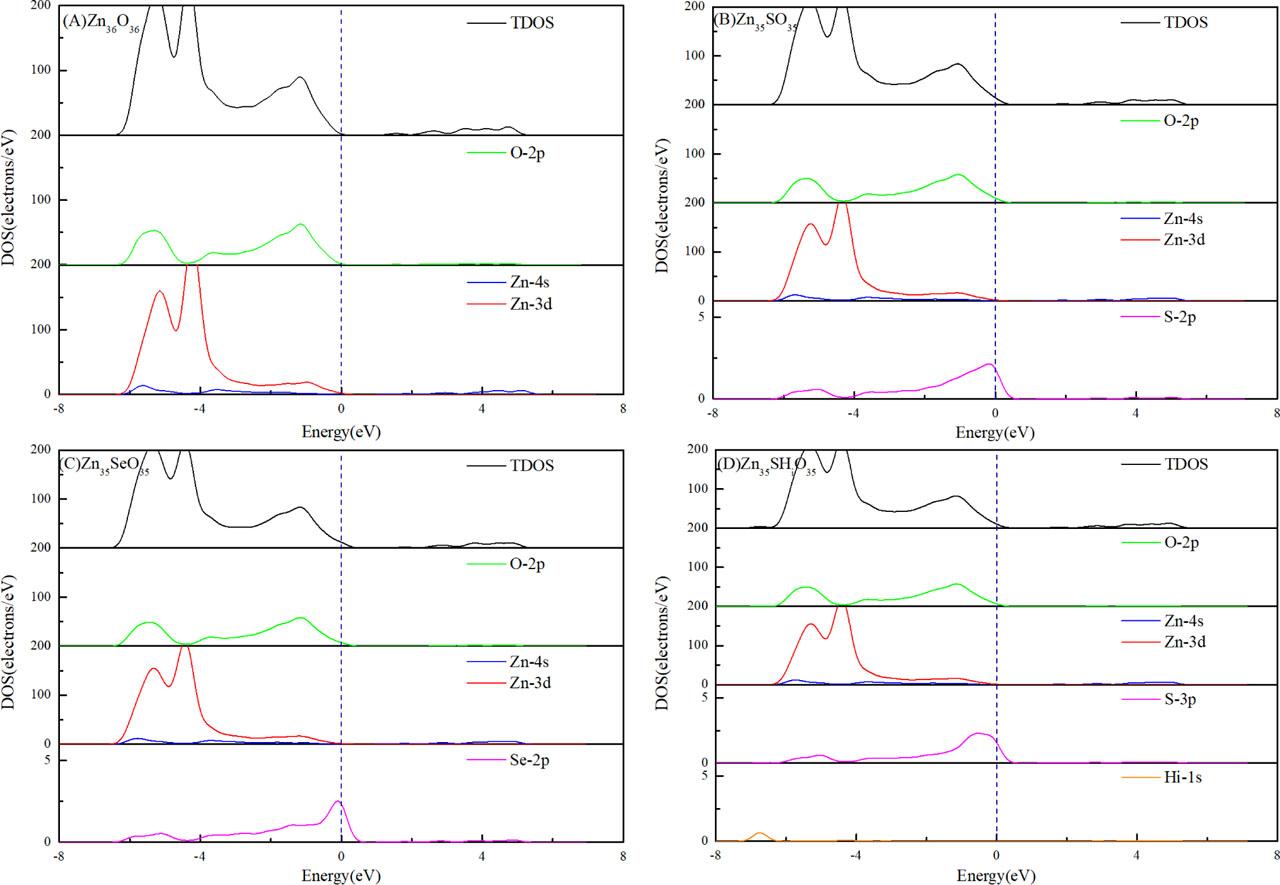 The total density of states (DOS) and partial density of states (PDOS) of the Zn36O36, Zn35SO35, Zn35SeO35, and Zn35SHiO35 systems were calculated to study the effect of doping defects on the hole concentration of the ZnO system (Figures 7A–7D).