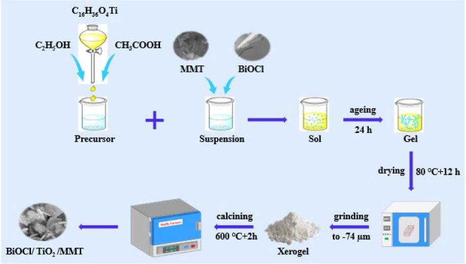 Then, BTMC composite materials were prepared using the sol-gel method [21] combined with the calcining (calcination) procedure and the preparation procedure shown in Figure 1. The details of the preparation method were as follows: 10 mL anhydrous ethanol was fully mixed with 5 mL glacial acetic acid, then 13.6 mL tetrabutyl titanate was slowly added and stirred for 30 min to form mixed solution C. A certain amount of MMT was dissolved in 50 mL deionized water to obtain the MMT suspension, and a certain amount of BiOCl was dispersed in the MMT suspension according to the molar ratio of Bi/Ti. The mixed solution C was slowly added to the MMT suspension, stirred for 3 h and aged for 24 h. The aged gel was dried in an oven at 80°C for 12 h, ground through a 200-mesh sieve, and then placed in a muffle furnace for calcining at 600°C for 2 h. The calcined samples are BTMC composite materials. The method of preparing TiO2/MMT composite materials (TMC) is the same except that no BiOCl is added. When the Bi/Ti molar ratio is 10%, 15%, 20%, 25%, and 30%, it is denoted as BTMC-10, BTMC-15, BTMC-20, BTMC-25, and BTMC-30 in sequence.