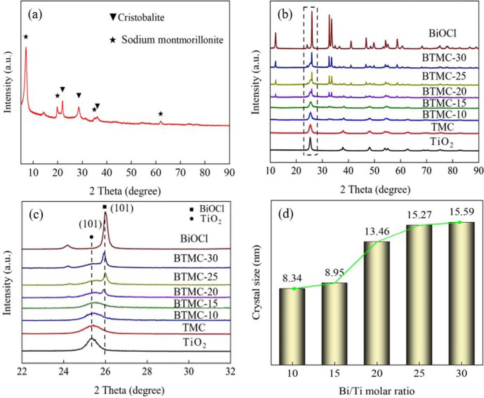 The XRD analysis results show that MMT is sodium montmorillonte, and the main impurity is cristobalite. TiO2 exists in BTMC as anatase crystal phase. The addition of MMT can inhibit the conversion of anatase to rutile, and excess BiOCl will inhibit the growth of TiO2 crystal. Moreover, with the increase of BiOCl content, the crystal size of BTMC gradually increases.