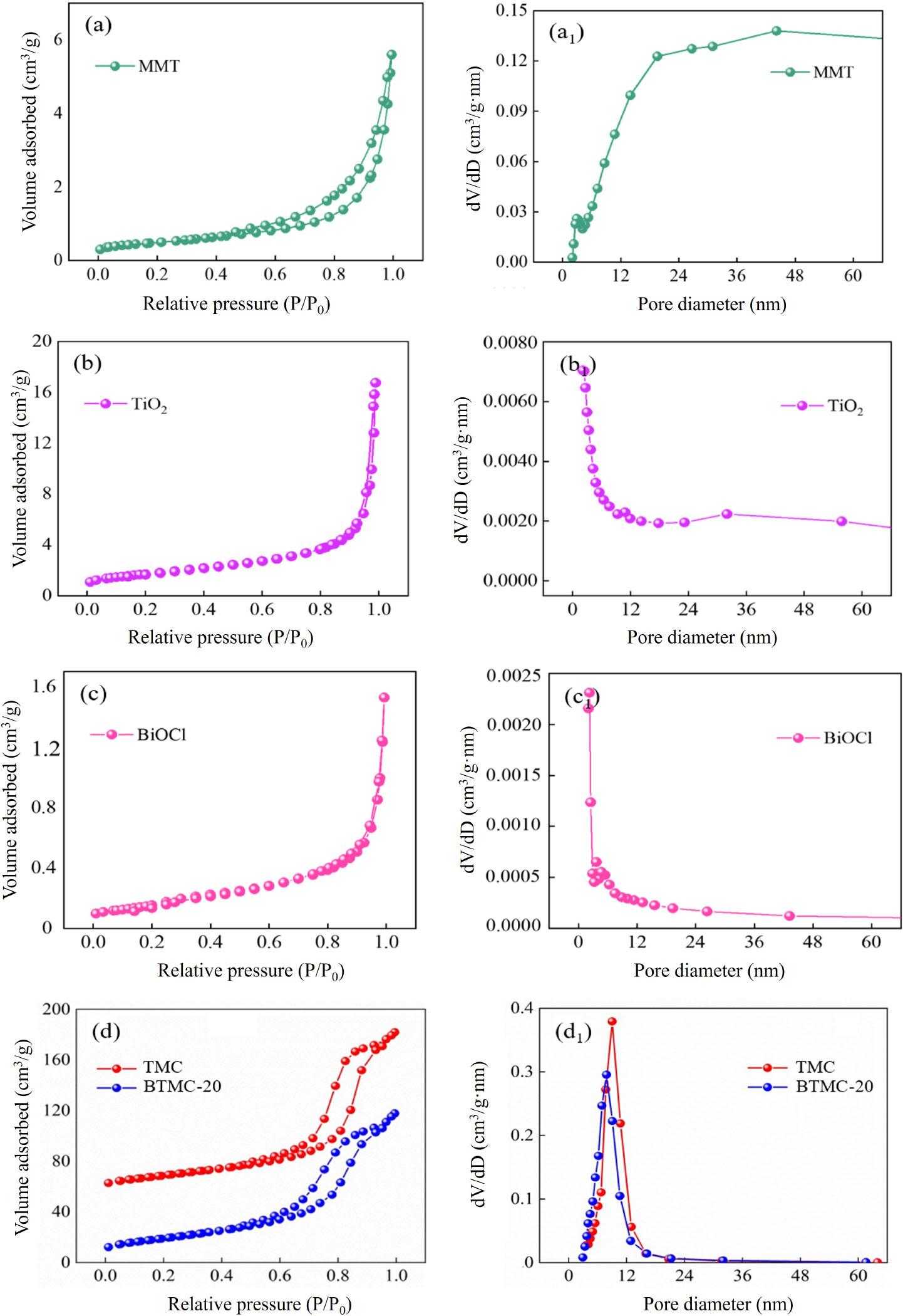 Figure 3a1-d1 and Table 2 show pore size distribution curves and the BET data of the materials, respectively. In Figure 3a1-c1, the pore size of MMT, TiO2, and BiOCl is mainly distributed between 2.75 nm~24 nm, which is consistent with their average pore sizes (MMT:19.84 nm; TiO2:18.43 nm; BiOCl:14.01 nm). The pore diameter of TMC and BTMC-20 was centered at 11.05 nm and 9.52 nm (Figure 3d1), respectively, again showing the mesoporous structure in the composite materials. Furthermore, the pore size of the BTMC-20 was slightly reduced after adding BiOCl, which was attributed to the presence of BiOCl inhibiting the growth of TiO2 crystals [30].
