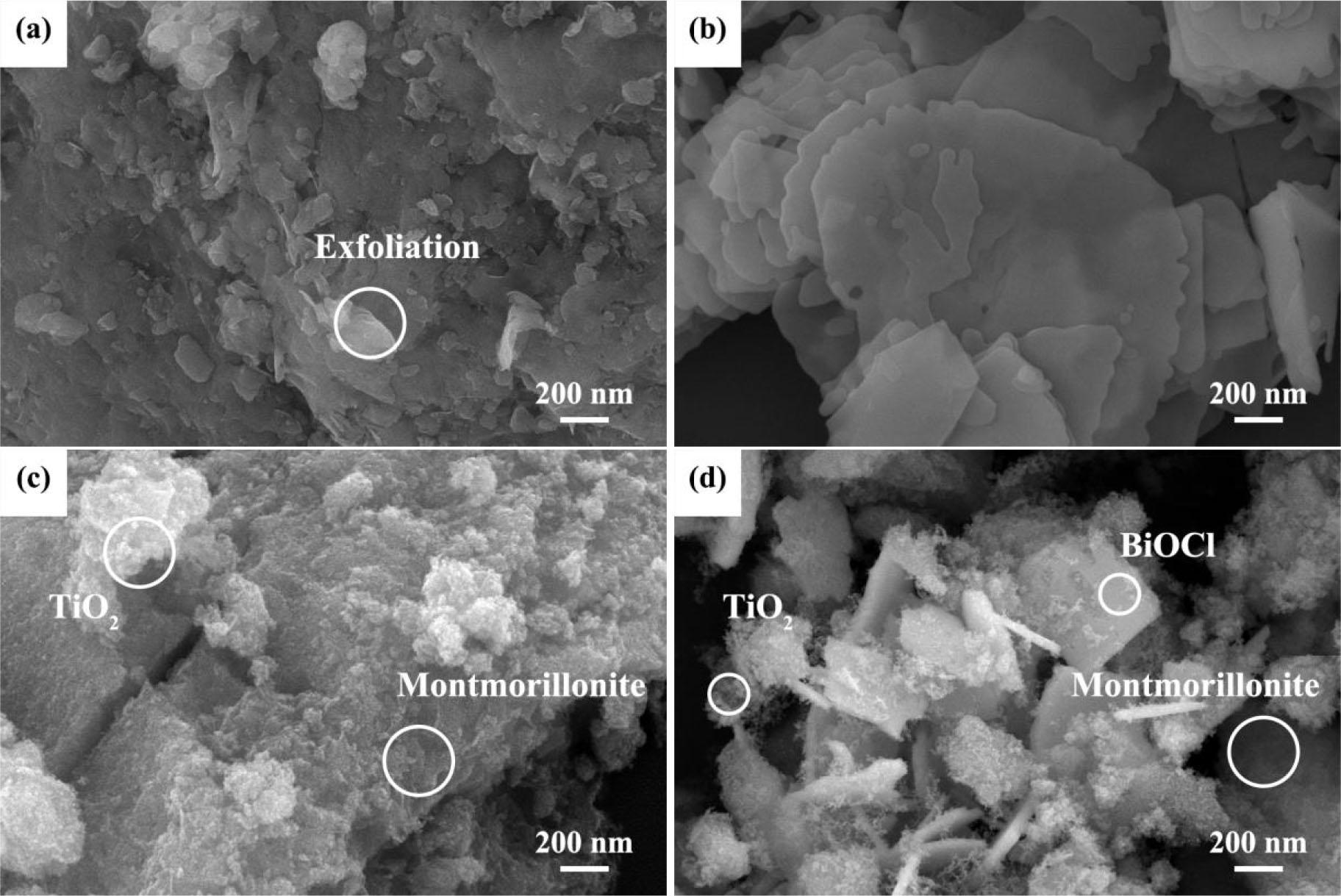 The SEM images of MMT (a), BiOCl (b), TMC (c), BTMC-20 (d)