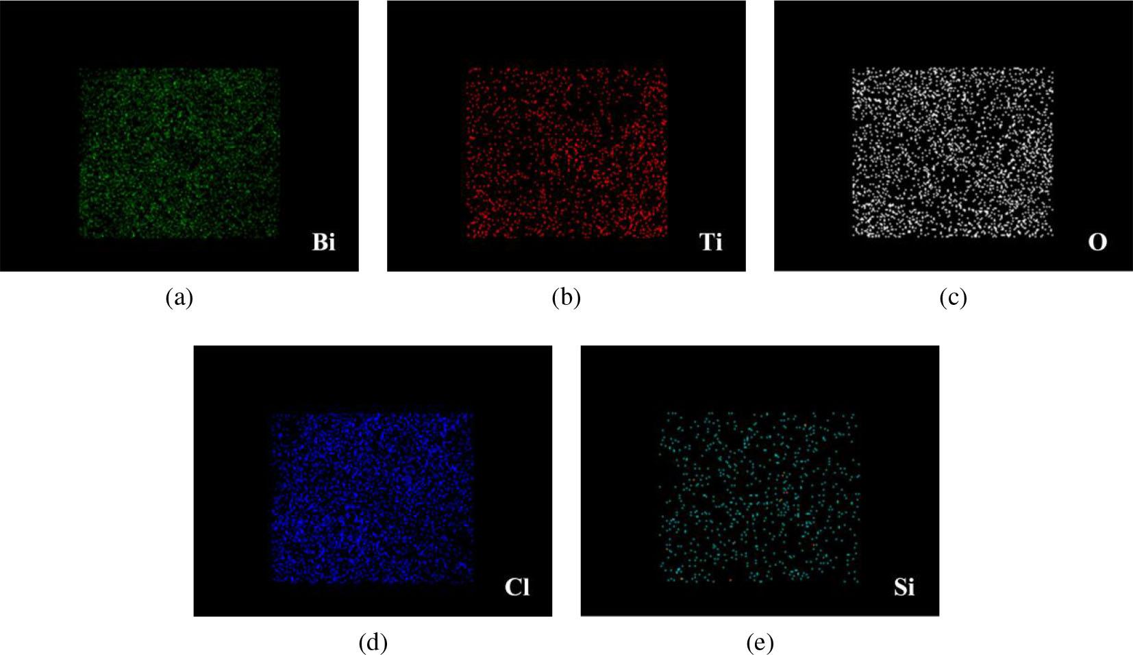 Figure 5 shows the EDX mapping of BTMC-20, and it was obtained by surface energy spectrum analysis of the graph interval of BTMC-20 in Figure 4d. BTMC-20 is mainly composed of Ti, O, Bi, Cl, and Si elements, indicating that BiOCl, TiO2, and MMT coexist in BTMC, which further confirms the successful preparation of BTMC-20. Comparison of the Ti and Bi elements shows that the distribution of Ti elements is more uniform, while the distribution of Bi elements is more concentrated, indicating that the lamellar accumulation of BiOCl greatly improves the dispersion of TiO2 particles.