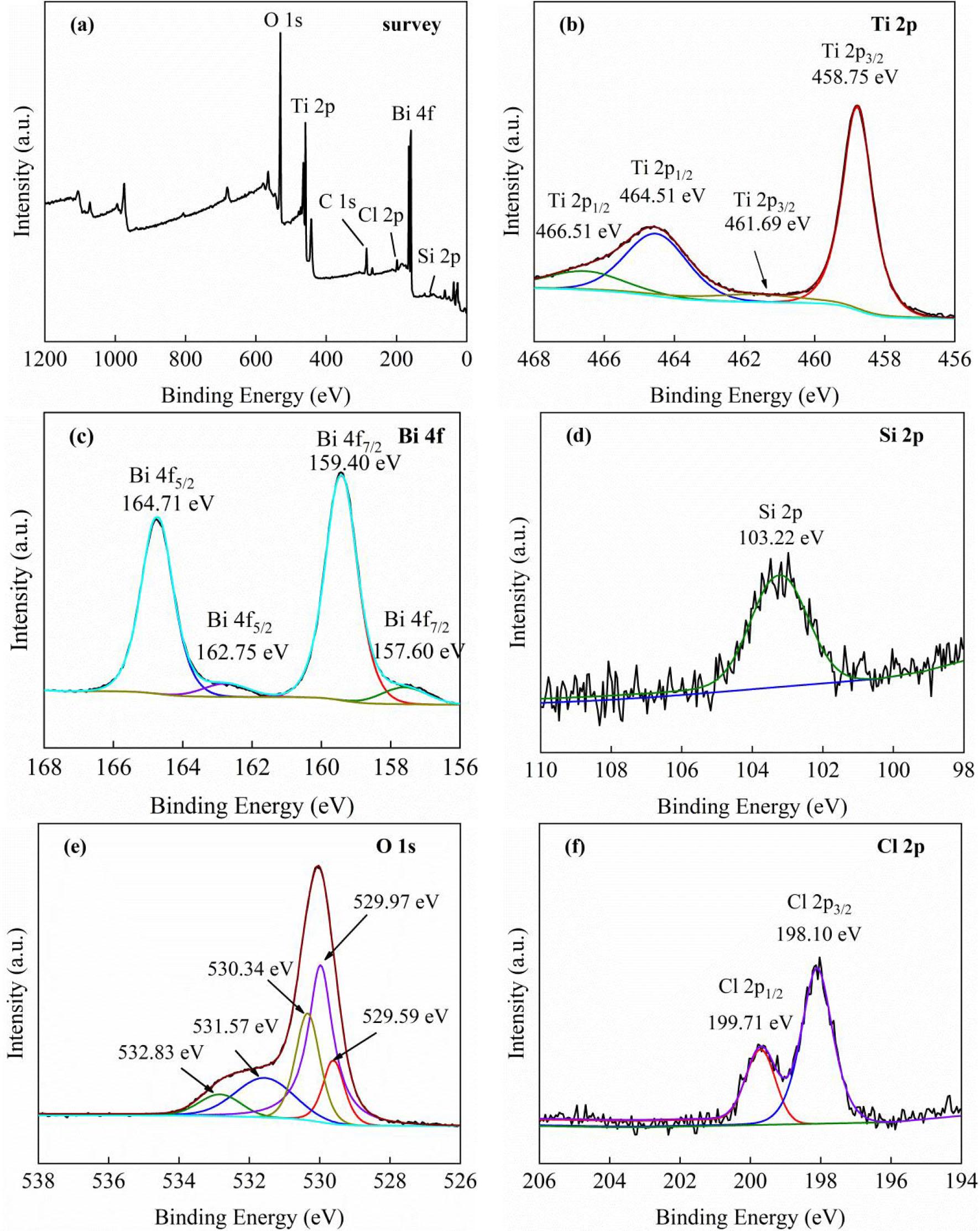 (a) The XPS of BTMC-20, (b) the high-resolution Ti 2p, (c) Bi 4f, (d) Si 2p, (e) O 1s, (f) Cl 2p of sample