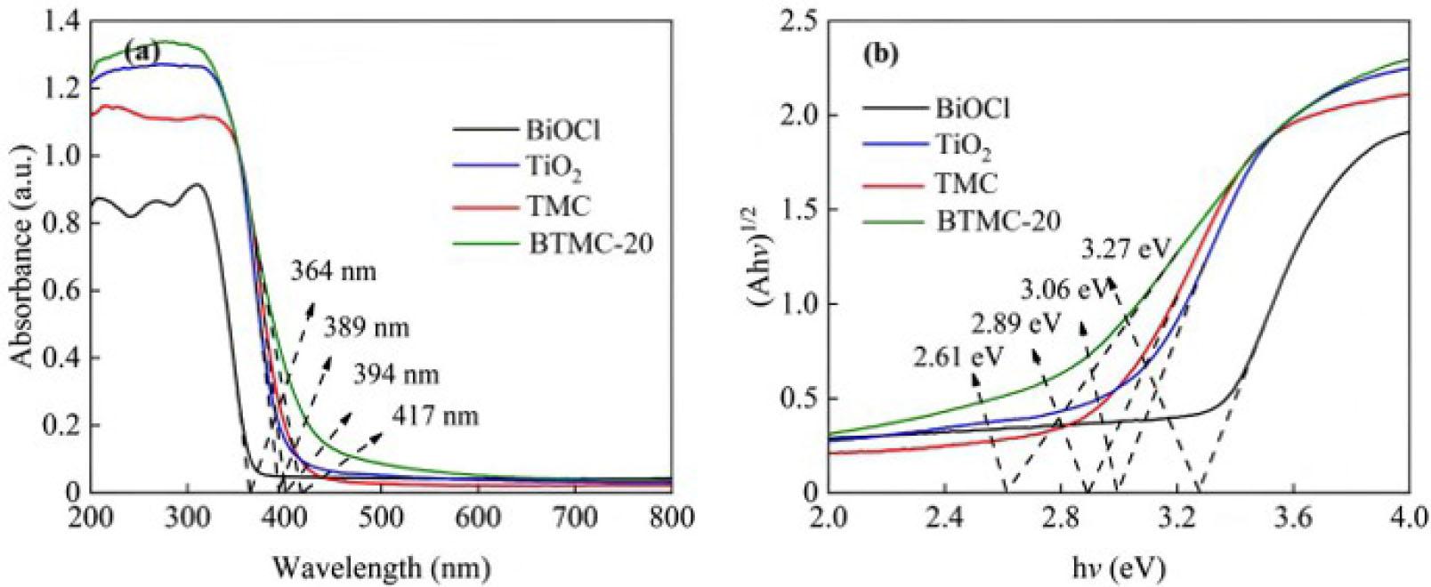 The band gaps of BiOCl, TiO2, TMC, and BTMC-20 are calculated according to formula (Eq. 2), and the results are shown in Figure 8b.