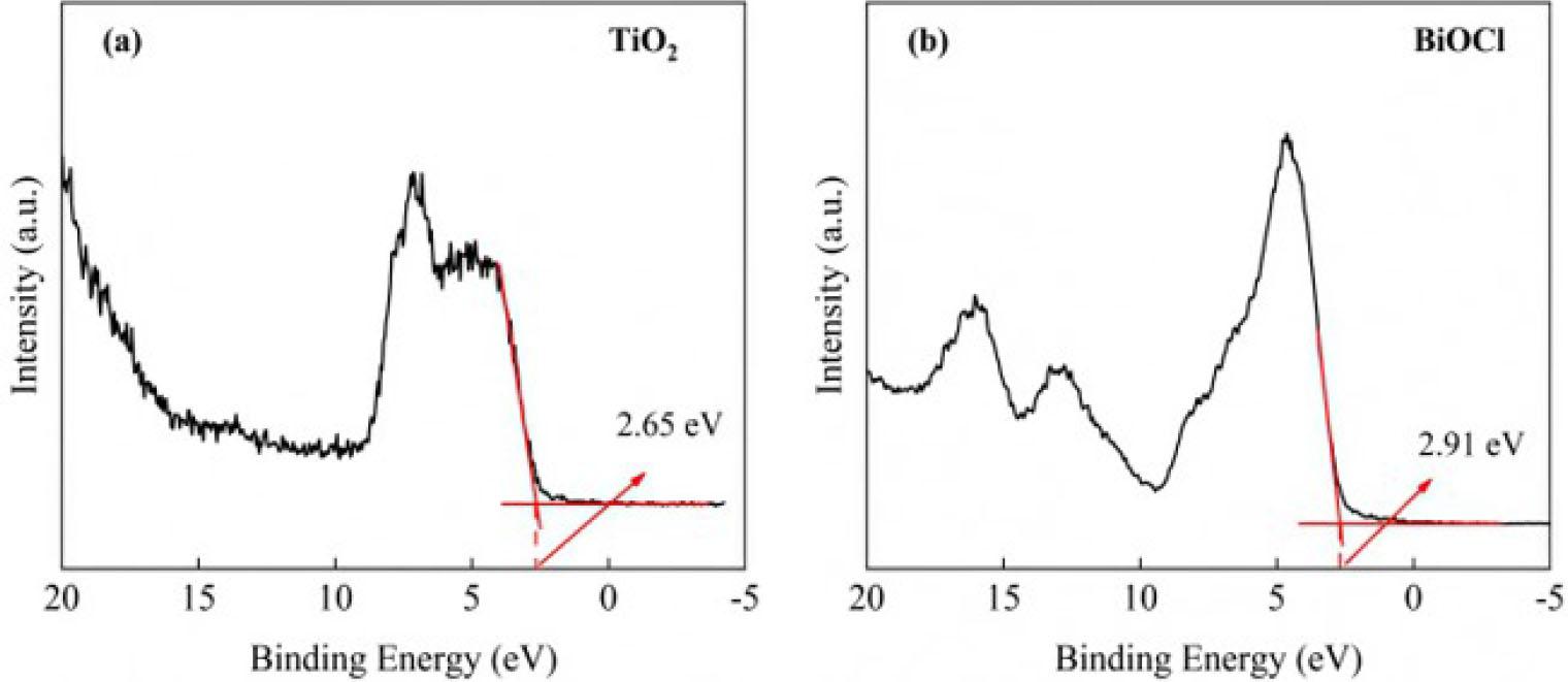 The valence-band XPS spectrum of TiO2 (a) and BiOCl (b)
