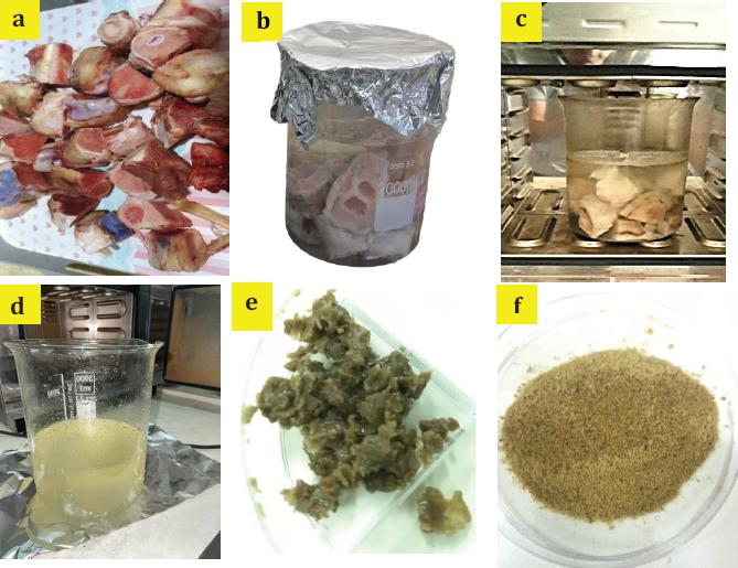 Both camel and bovine gelatin were extracted by cutting the bones into approximately 3-cm pieces as shown in Figure 1a. The bones were cleaned of grease and impurities and boiled in water for two hours at a temperature of 90°C. After that, the bones were washed off and dried in the oven for 24 hours at 60°C. The bones were treated in 1M hydrochloric acid for 72 h at room temperature to demineralize and partially hydrolyze collagen (Fig.1b). The remaining acid traces were removed by washing in cold water at less than 20°C. The bones were then neutralized using 4% w/v ammonium sulfate at 75°C for 3 h. The gelatin was extracted from the bones in distilled water in a ratio of 1:3 w/v at 90°C for 1 hour (Fig.1c). The gelatin solution produced (Fig.1d) was filtered through cheesecloth, and the supernatant was then vacuum dried at a temperature of 75°C for as long as necessary until all solvents evaporated, leaving a solid gel “gelatin,” as shown in Figure 1e. Finally, the gel was then dried, ground into a powder (Fig.1f), and stored at room temperature for later use.