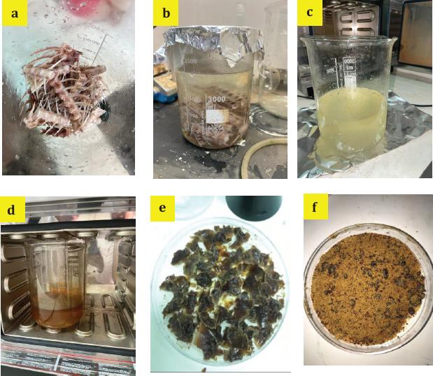 Fish gelatin extraction process: (a) bone pieces, (b) demineralized and partially hydrolyzed collagen, (c) gelatin extraction, (d) filtered gelatin, (e) evaporation of solvent, and (f) dried gelatin powder